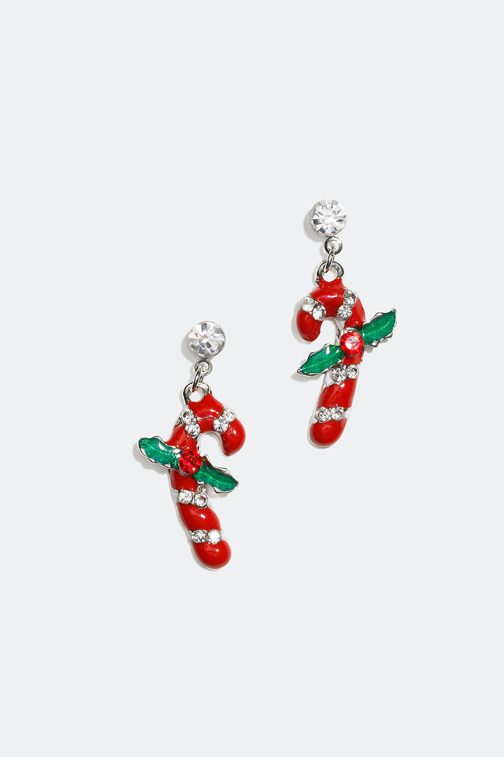 Øredobber med hengende motiv i form av polkagriser med misteltein. Øredobbene er dekorert med glassteiner, noe som gir litt glitter. Perfekte øredobber til alle julens anledninger.