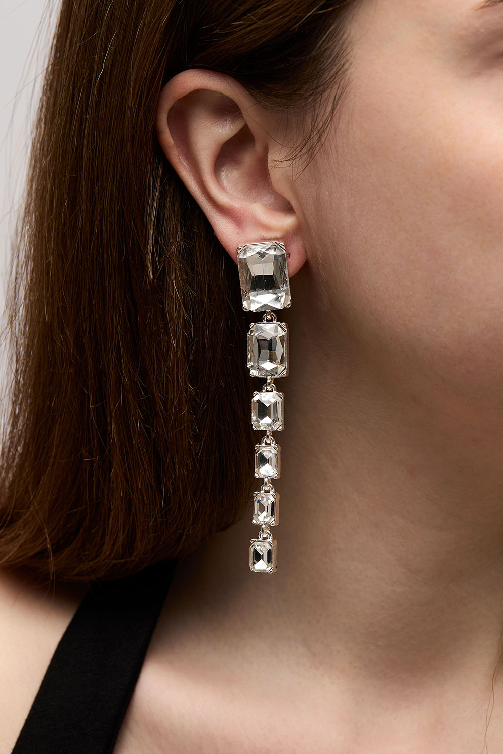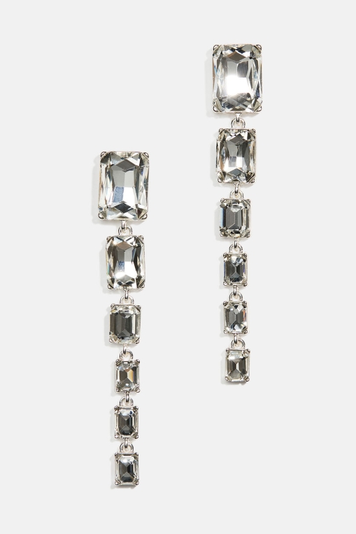 Lange, hengende øredobber med hvite rektangulære glassteiner som henger i rekkefølge etter størrelse.