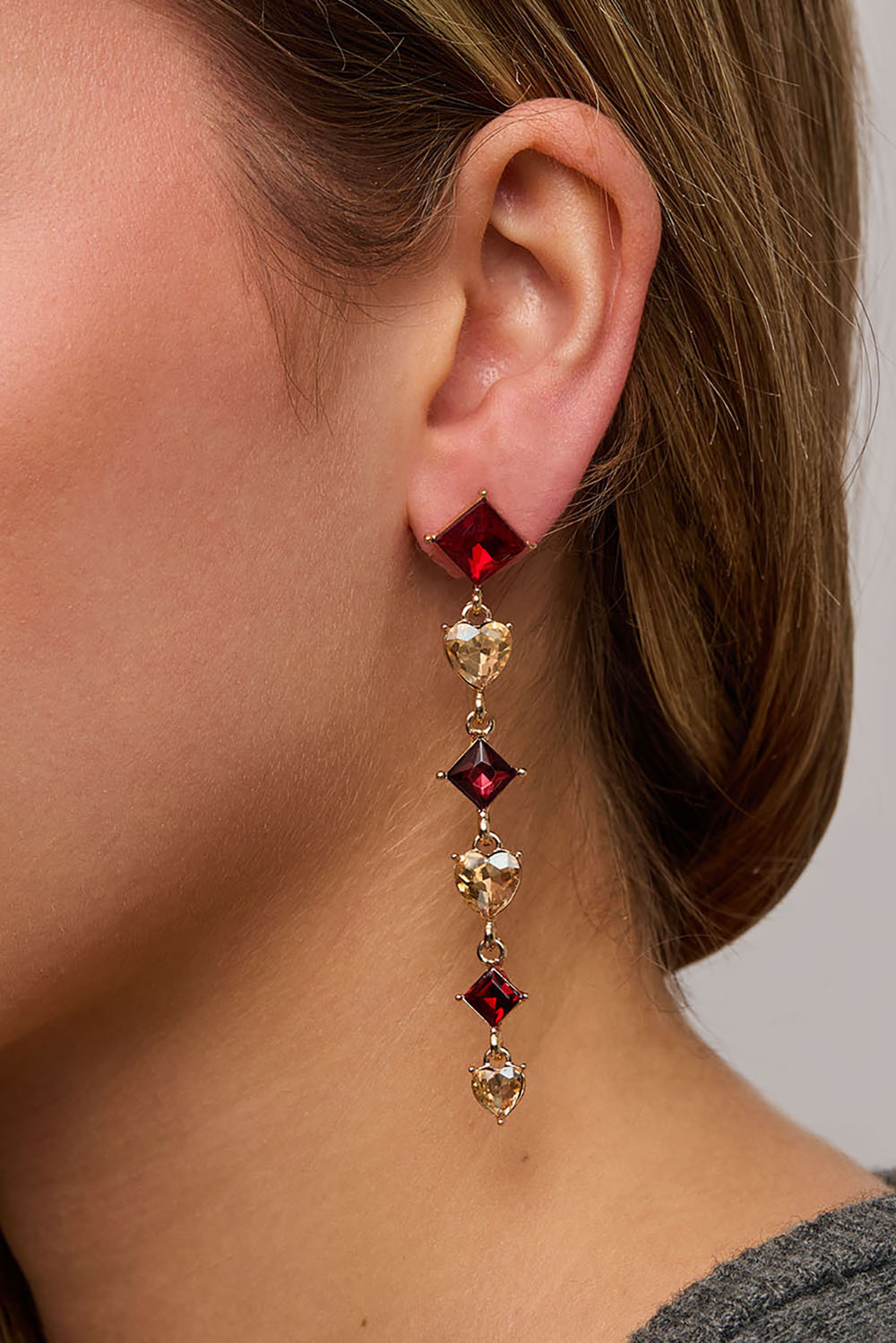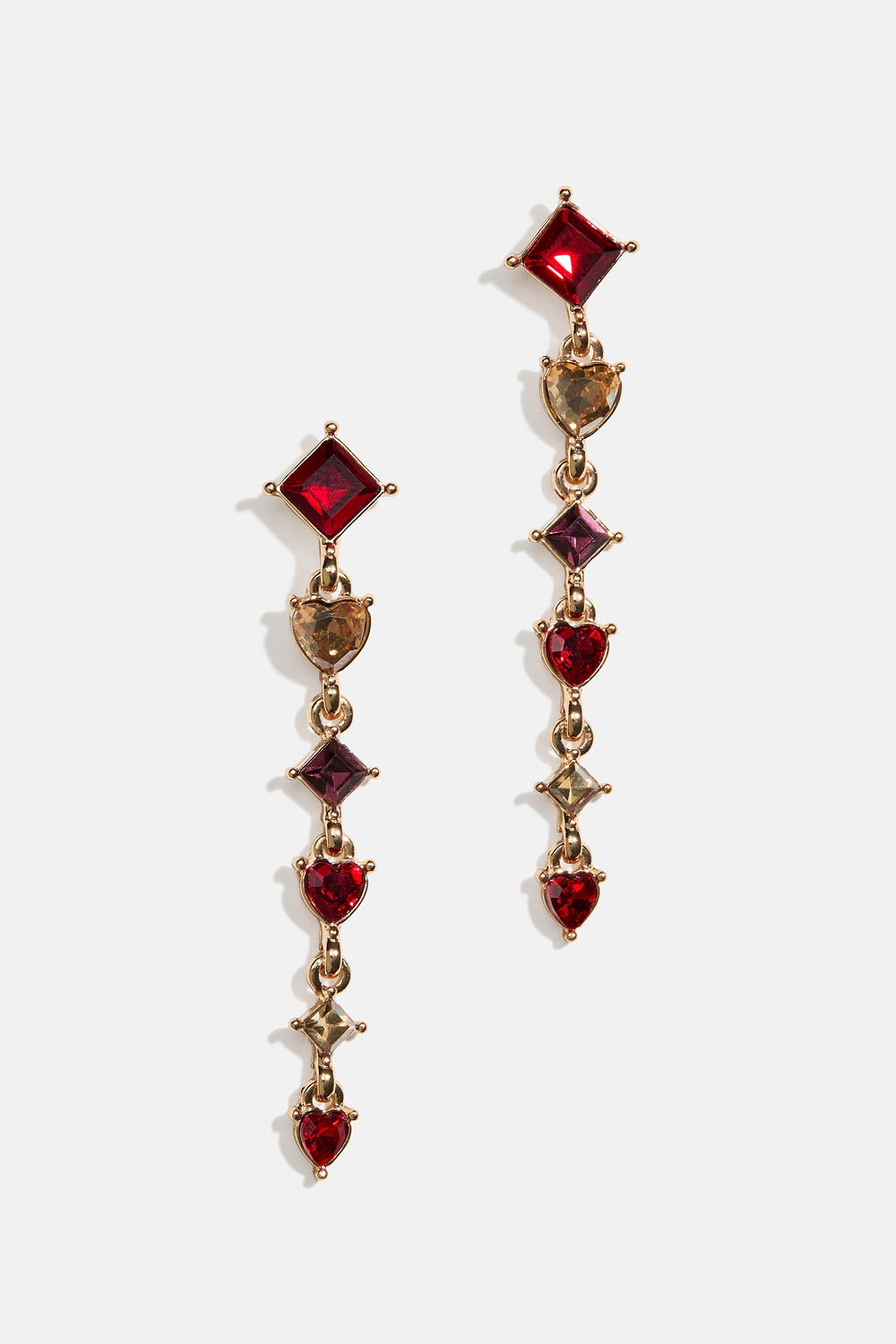 Øredobber i gullfarget metall med kvadratiske og hjerteformede glassteiner i rødt og beige.