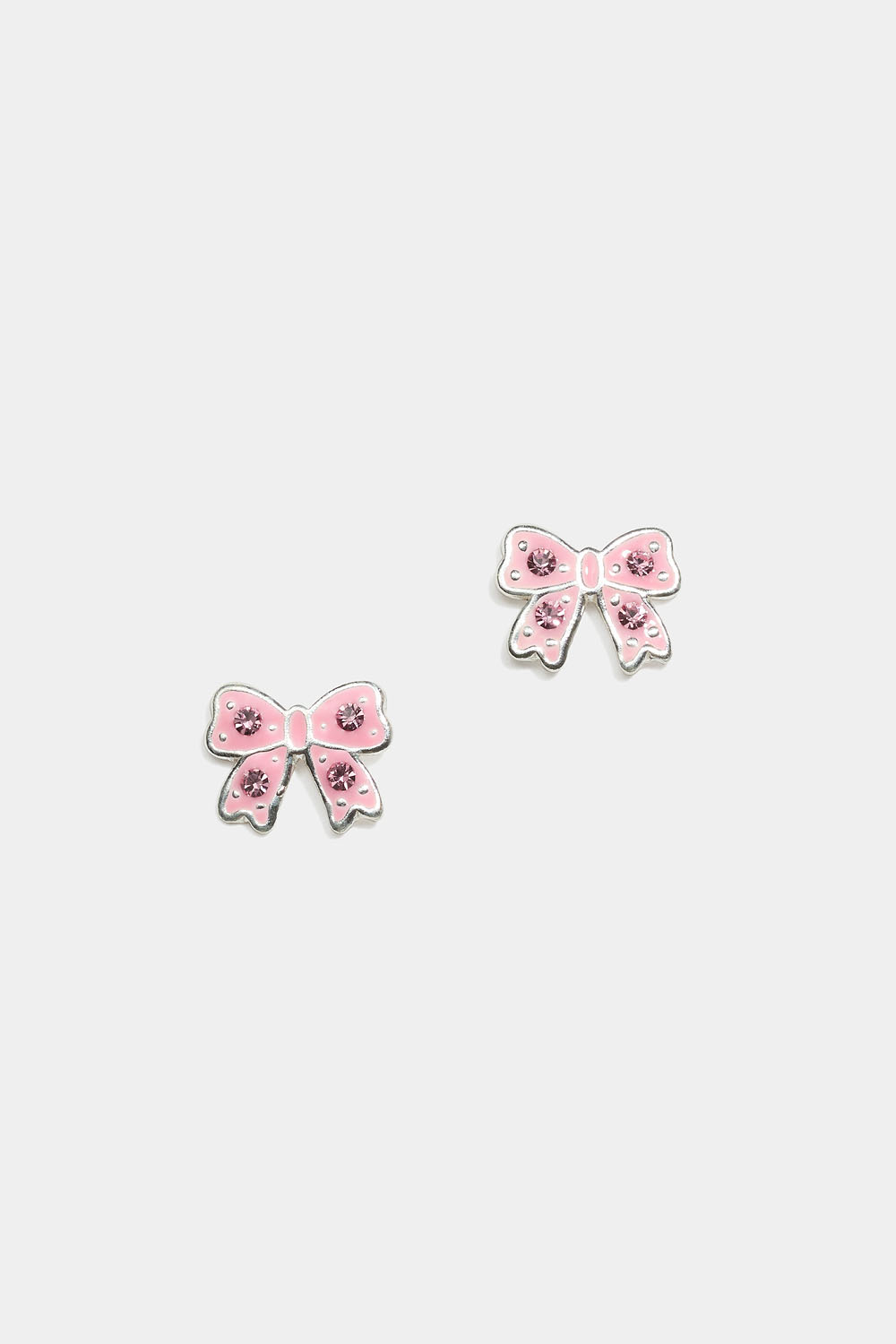 Små øredobber i sterlingsølv med rosa sløyfer dekorert med rosa steiner.