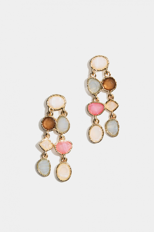 Øredobber med to anheng laget av plaststeiner med organiske former og forskjellige farger.