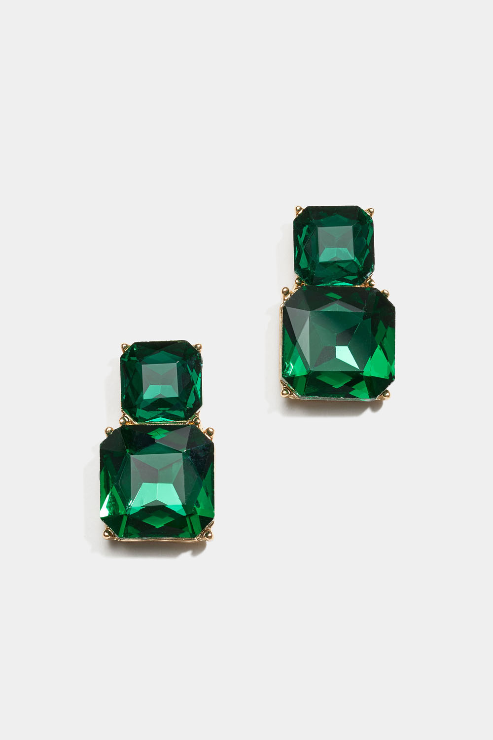 Stiftøredobber i gullfarget metall med to kvadratiske, grønne glassteiner i forskjellig størrelse.