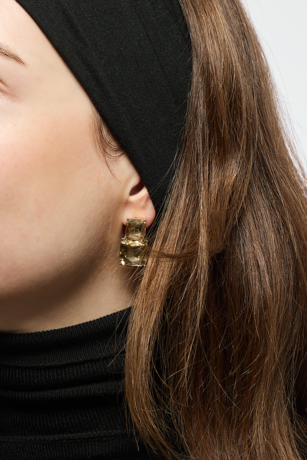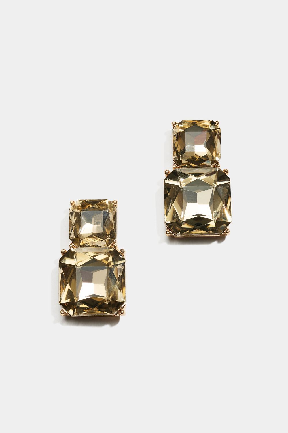 Stiftøredobber i gullfarget metall med to kvadratiske, lysebrune glassteiner i forskjellig størrelse.