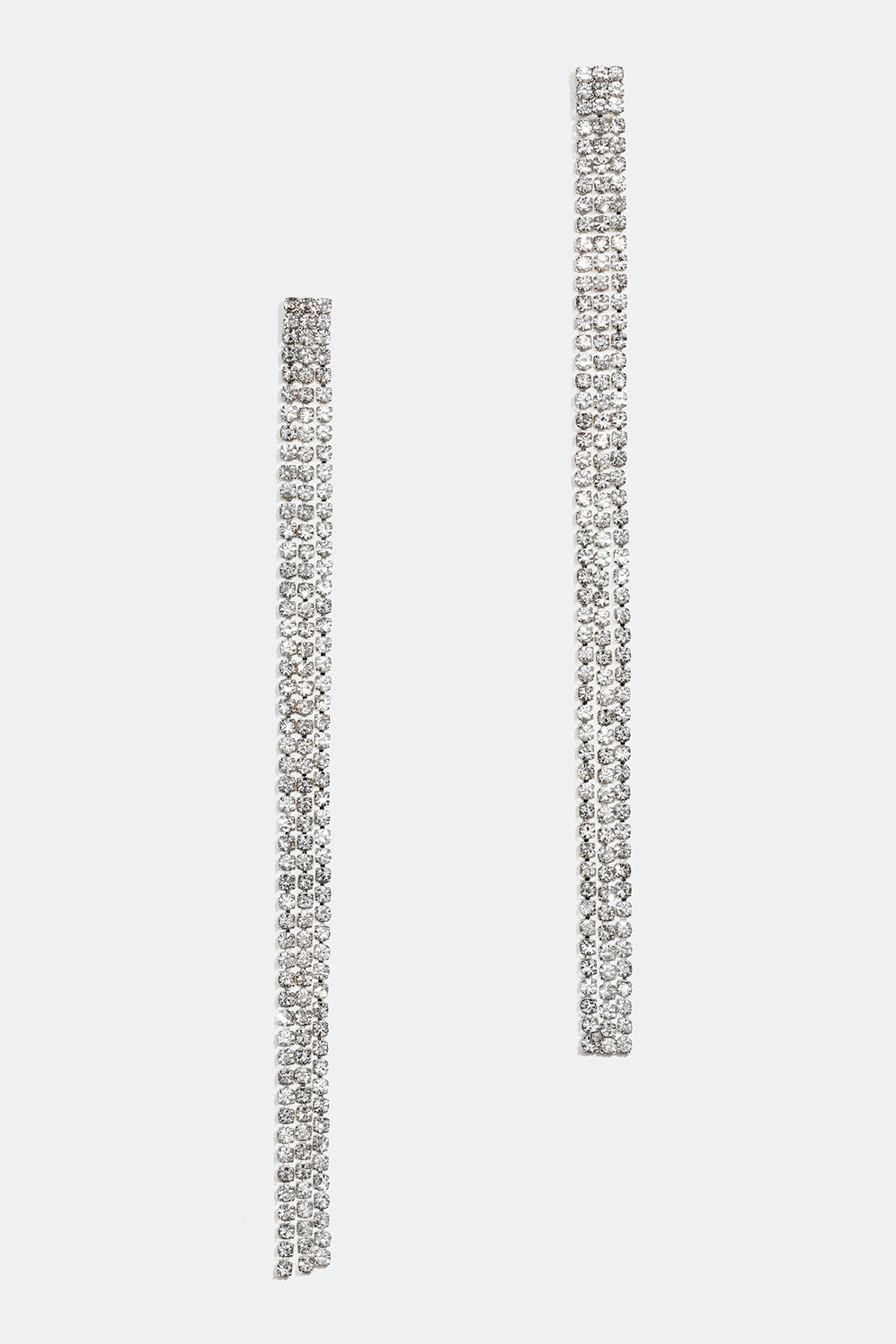 Lange øredobber i metall med tre hengende strasslenker pyntet med glasstener. Et glitrende strassmykke som passer perfekt til festlige anledninger.