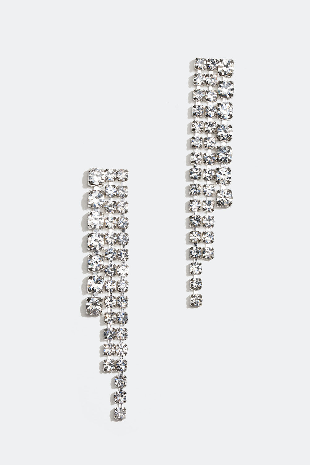 Øredobber med tre lenker i forskjellige lengder som er dekorert med runde glassteiner i forskjellige størrelser. Perfekte strassøredobber til festlige anledninger.