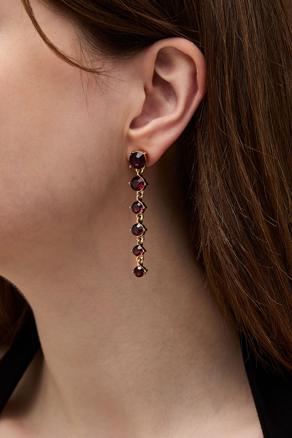 Øredobber i gullfarget metall med runde burgunderfargede glassteiner i synkende størrelse.