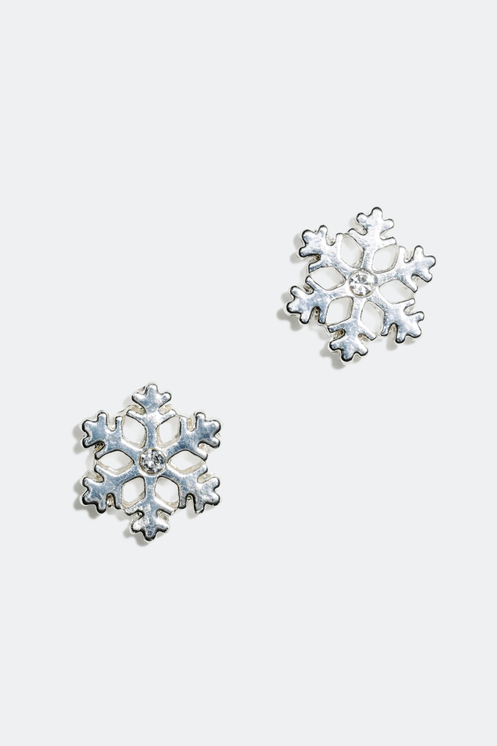 Sølvfargede øredobber formet som små snøkrystaller. Bli julefin med disse vakre øredobbene som er dekorert med krystallfargede glassteiner.