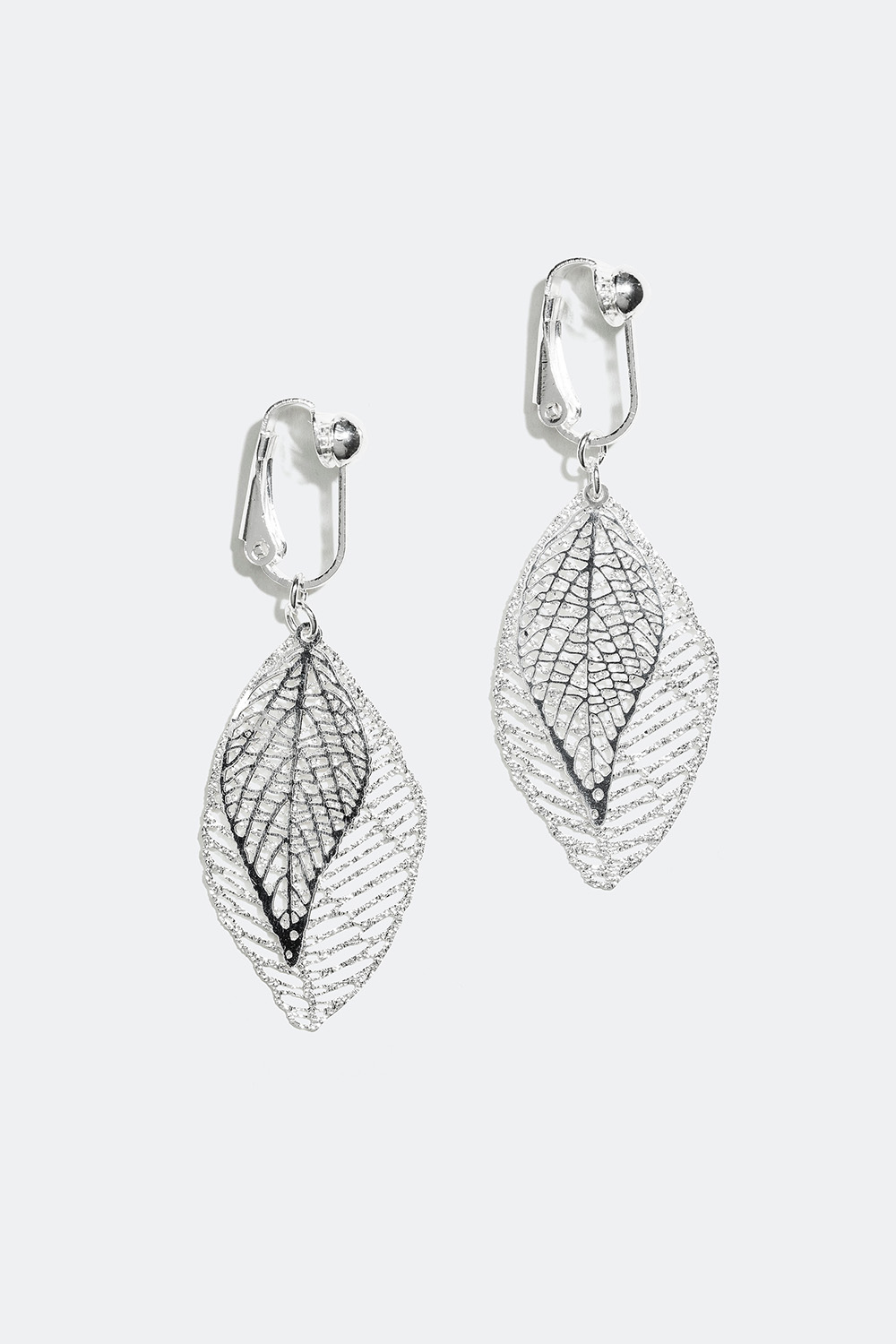 Øreklips med et fint anheng av to blader med detaljerte utskjæringer. Perfekt for deg som ikke har hull i ørene, men er på utkikk etter dekorative øredobber.