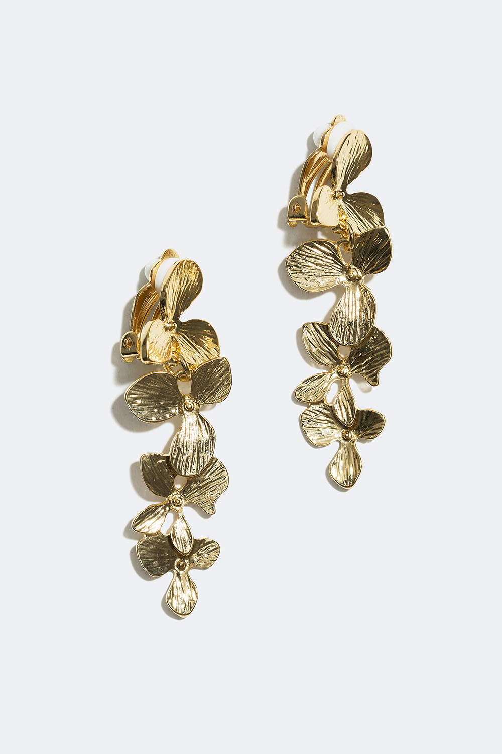 Øreklips i gyllent metall med fire blomster som henger etter størrelse, der den største blomsten er festet til øret. Et perfekt smykke for deg som ikke har hull i ørene, men er på utkikk etter dekorativ ørepynt.