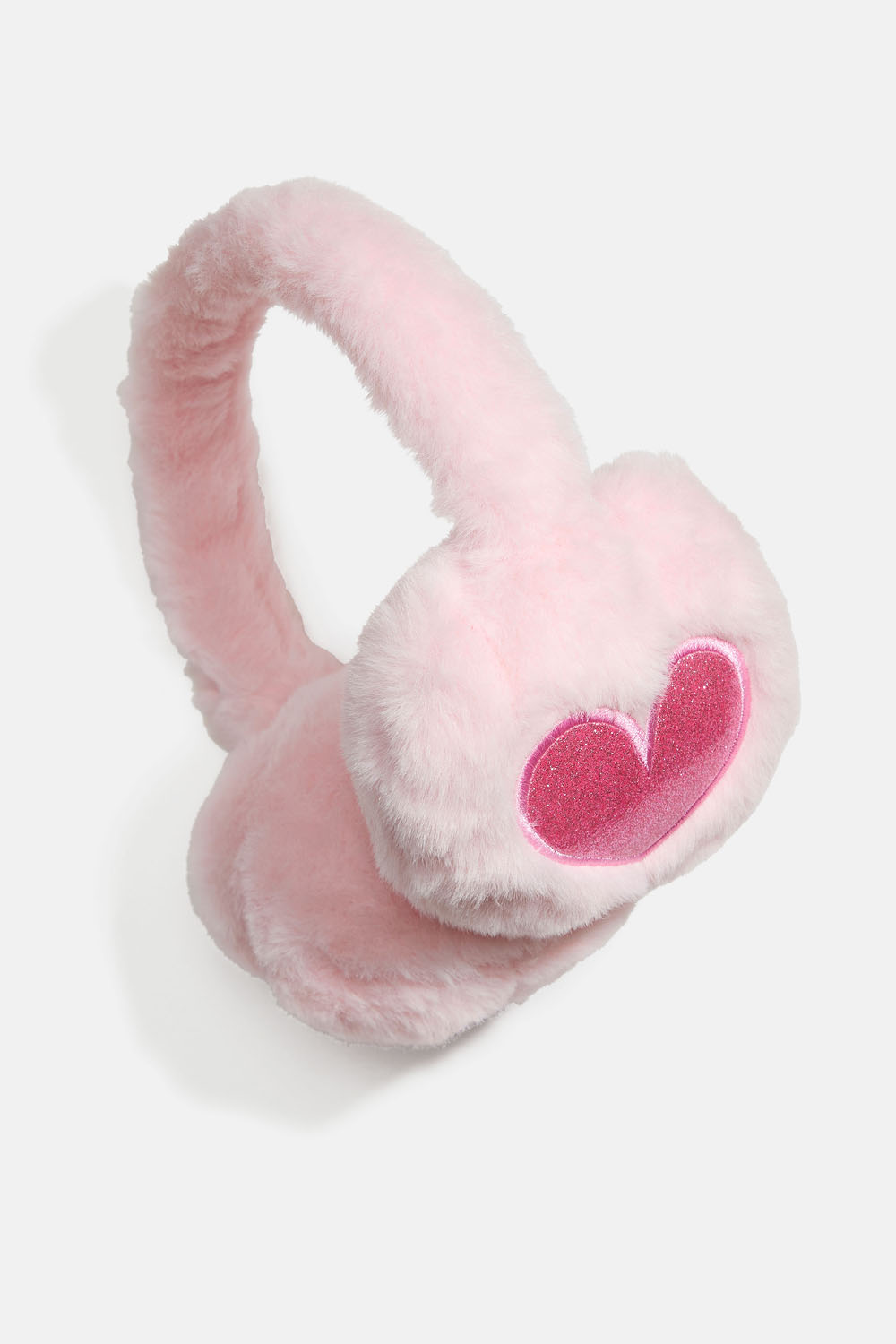 Øremuffer i luftig rosa stoff med glitrende hjerter.