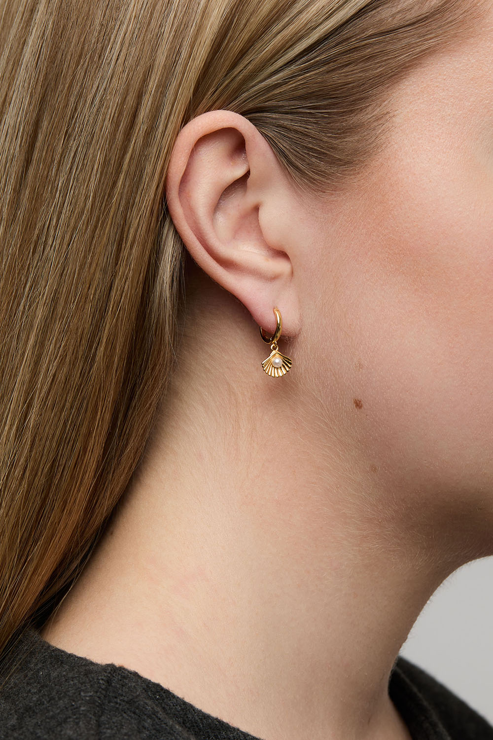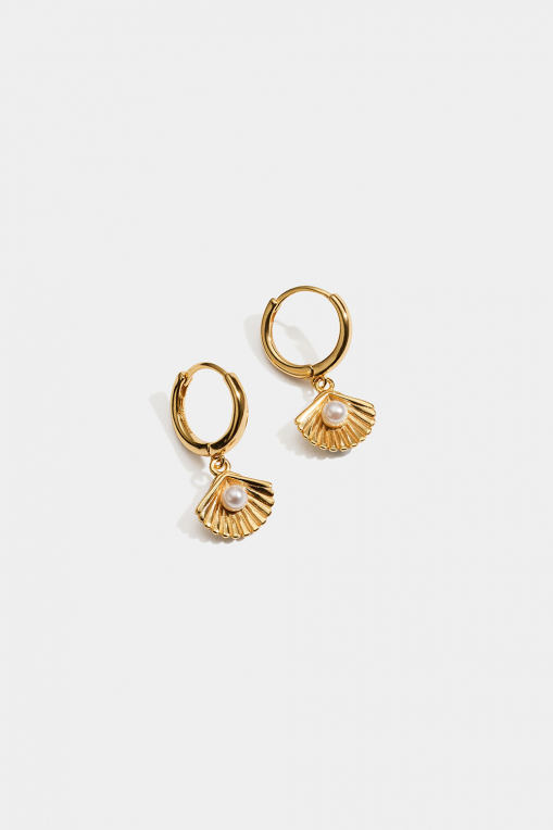 Øreringer i 18 karat gullbelagt sterlingsølv med anheng av skjell med skjellperler.