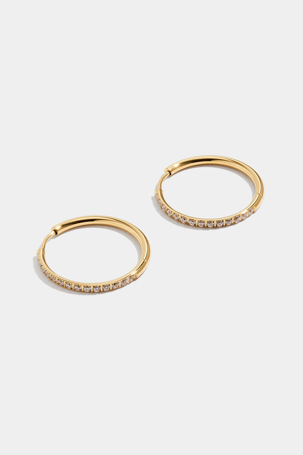 Øreringer i høypolert rustfritt stål, PVD-belagt med 18 karat gull og zirkonia-steiner.