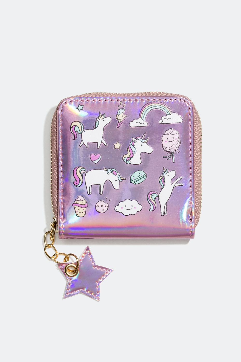 Rosa lommebok i glansfullt materiale med blant annet regnbue, stjerner og iskrem som motiver. Lommeboken har svart innside med to rom og åpnes og lukkes med en gyllen glidelås.