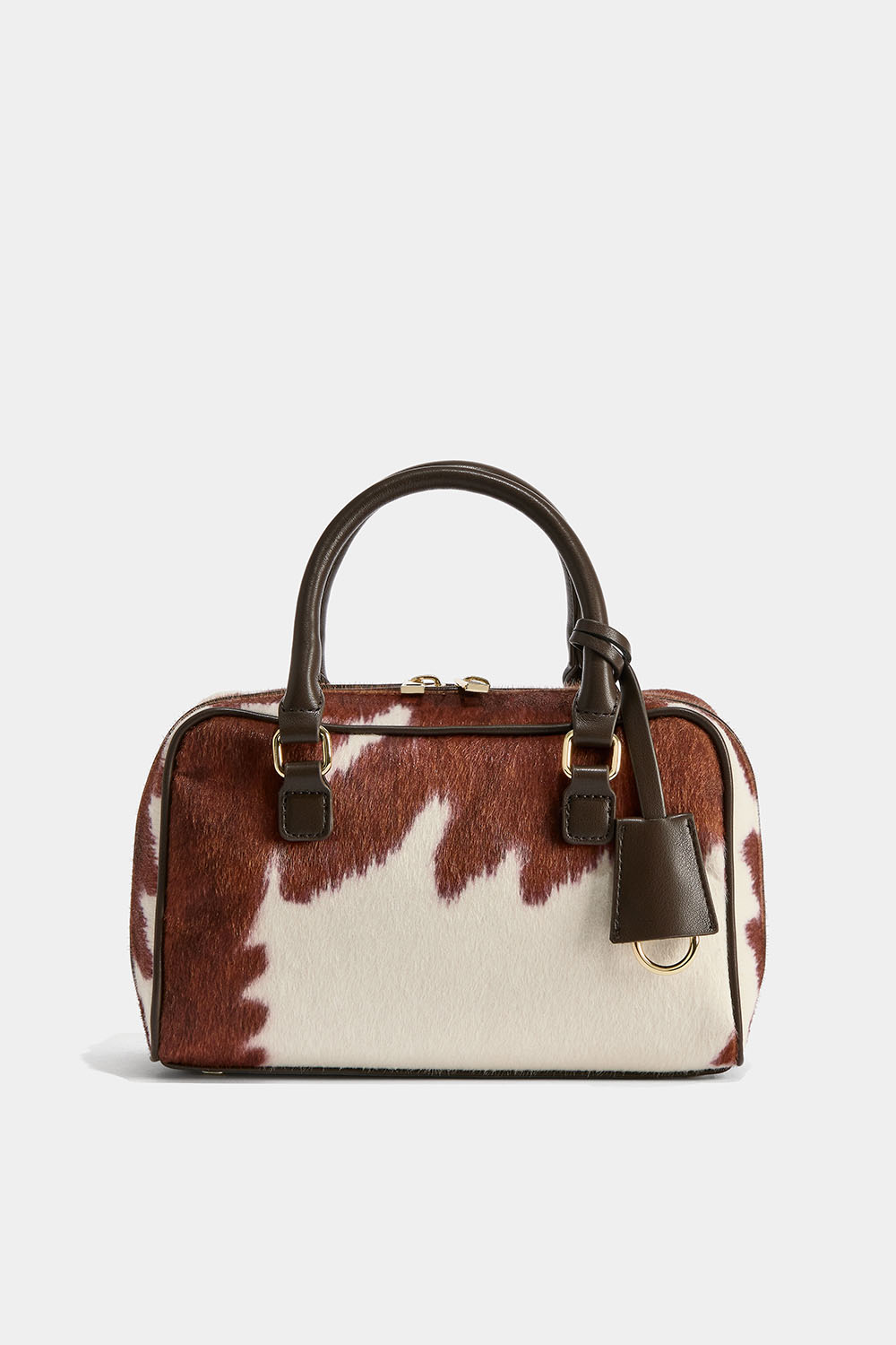 Liten, rektangulær veske i brunt kunstskinn med doble håndtak og crossbody-reim. Reimen er avtakbar, og vesken lukkes med en gullfarget glidelås. Den har også en liten innerlomme som lukkes med glidelås. Vesken kommer også med en tilhørende nøkkelring som henger fra ett av håndtakene.