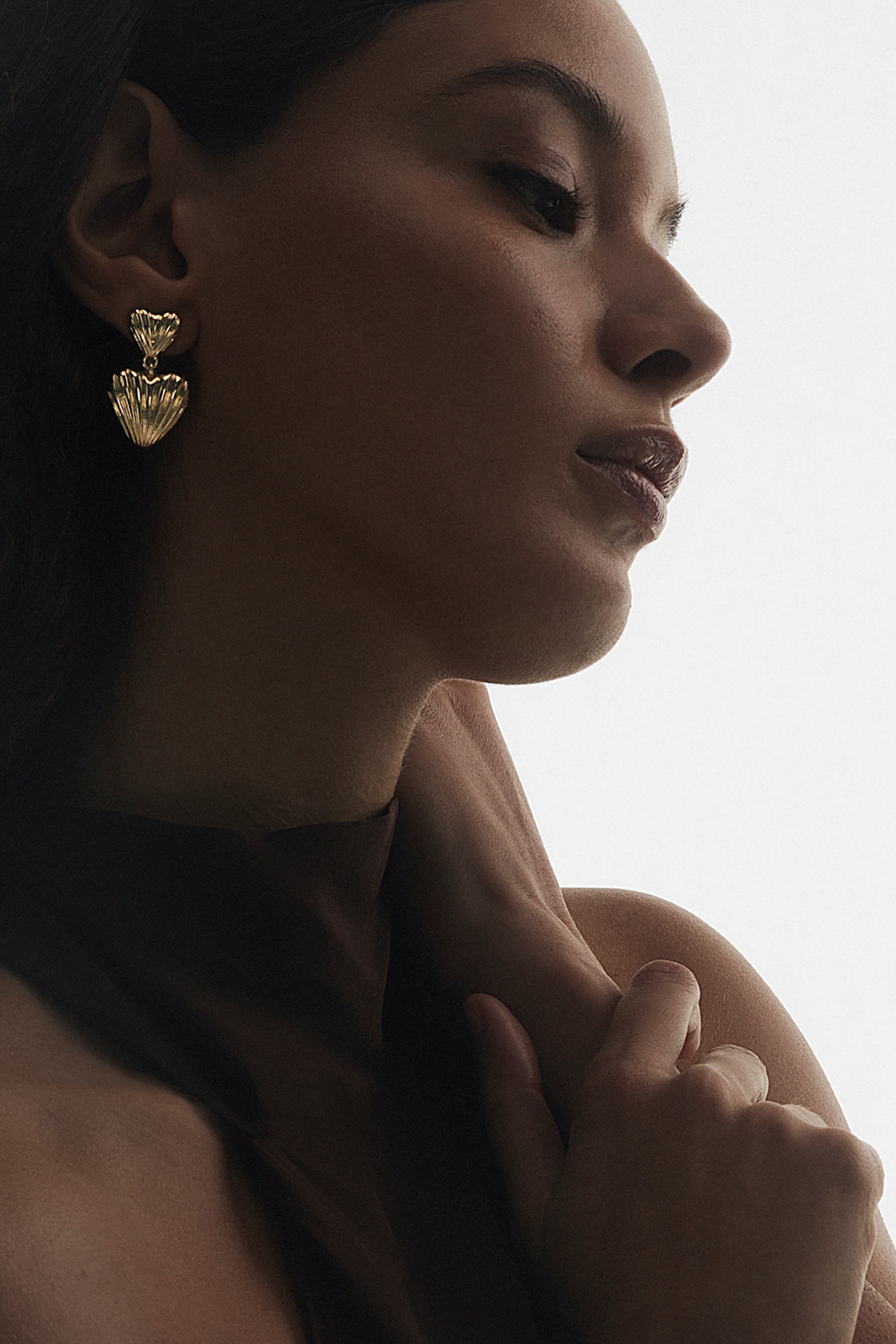 Rillede øredobber i gullfarget metall med to hjerter i et kraftig design.