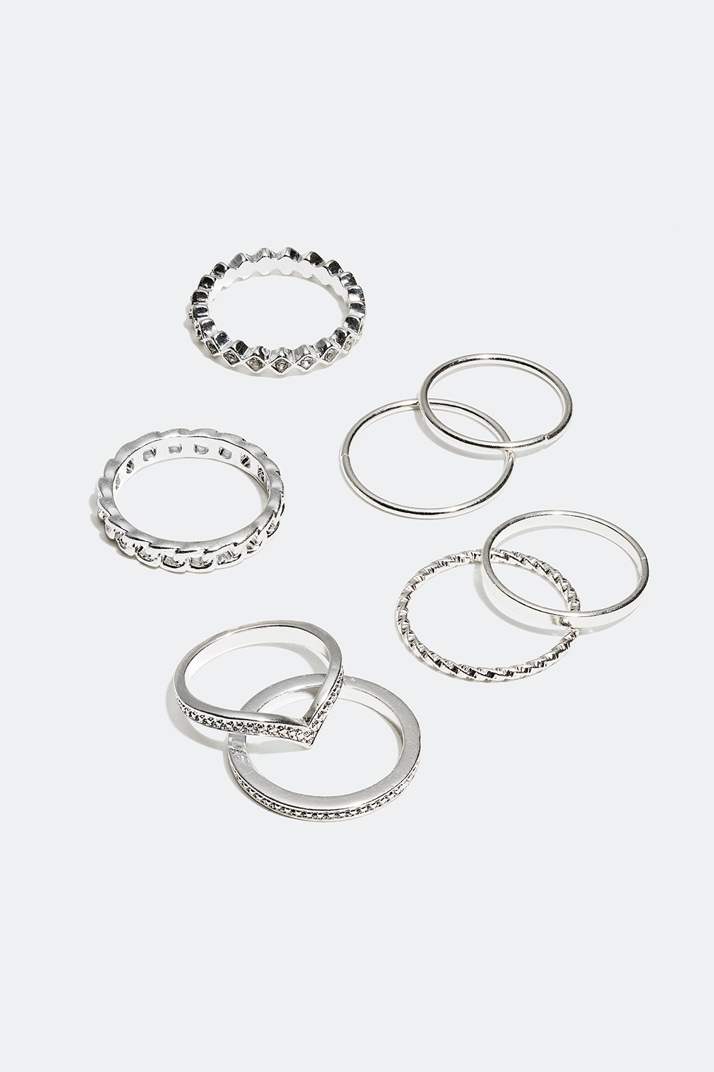 8-pakning med ringer med forskjellige utforminger og størrelser, slik at man kan bruke ringene samtidig på forskjellige fingre. Pakken inneholder en blanding av ringer i størrelsene 16/17/18 eller 18/19/20. En perfekt kombinasjon av ringer med både glatt, mønstret og tvunnet design samt dekorative glassteiner.