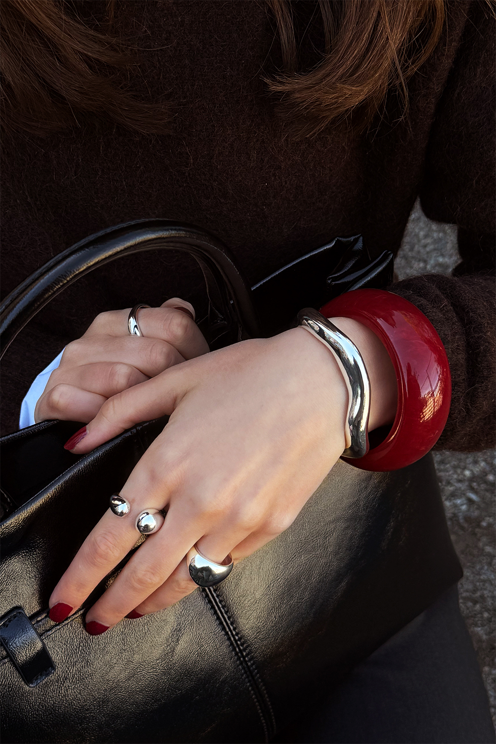 Bredt armbånd i rød resin med hvite marmordetaljer.