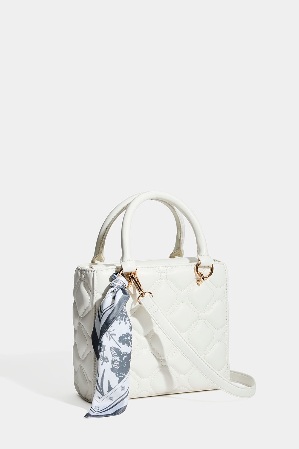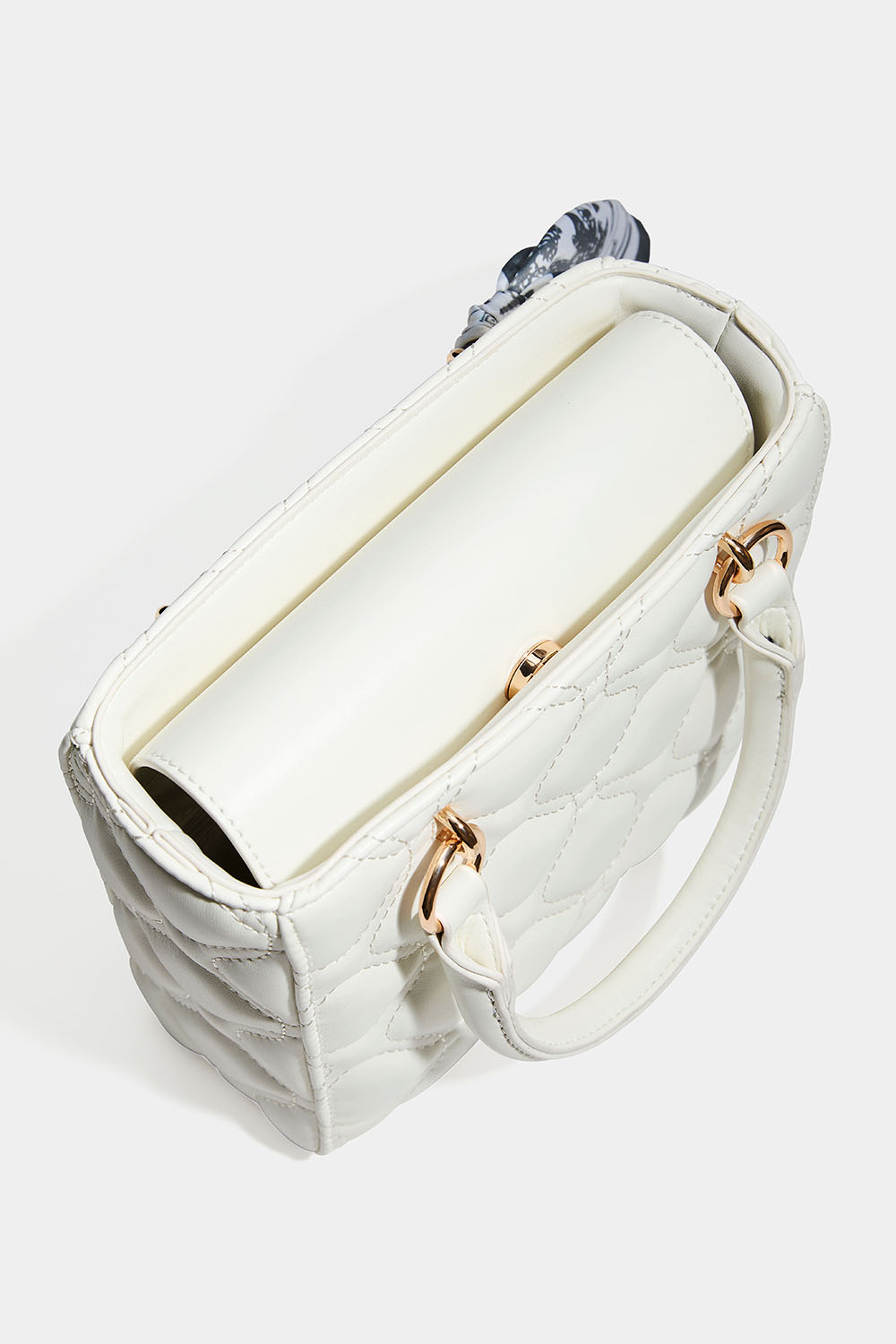 Rosa veske med quiltet design og skjerf