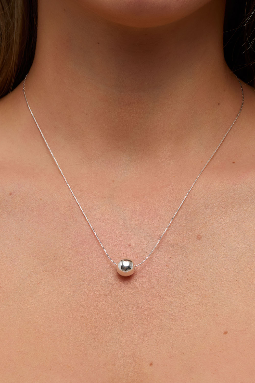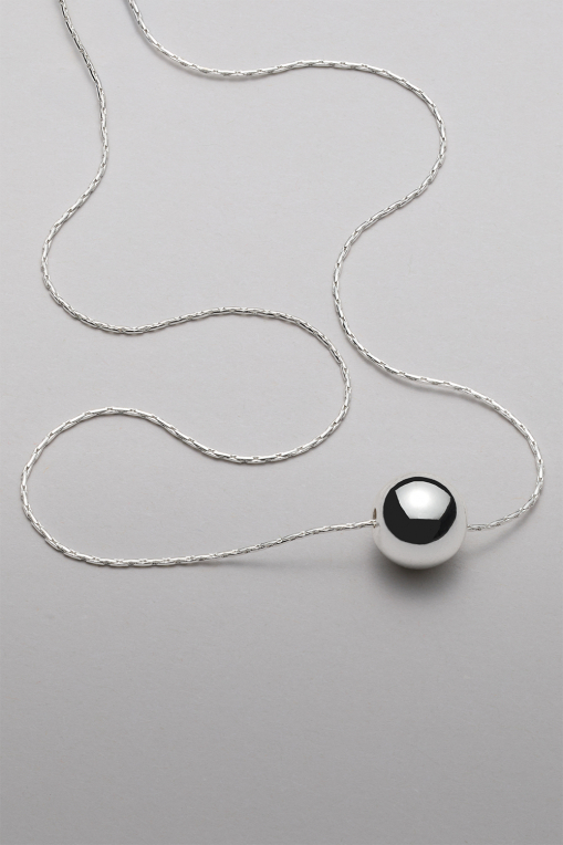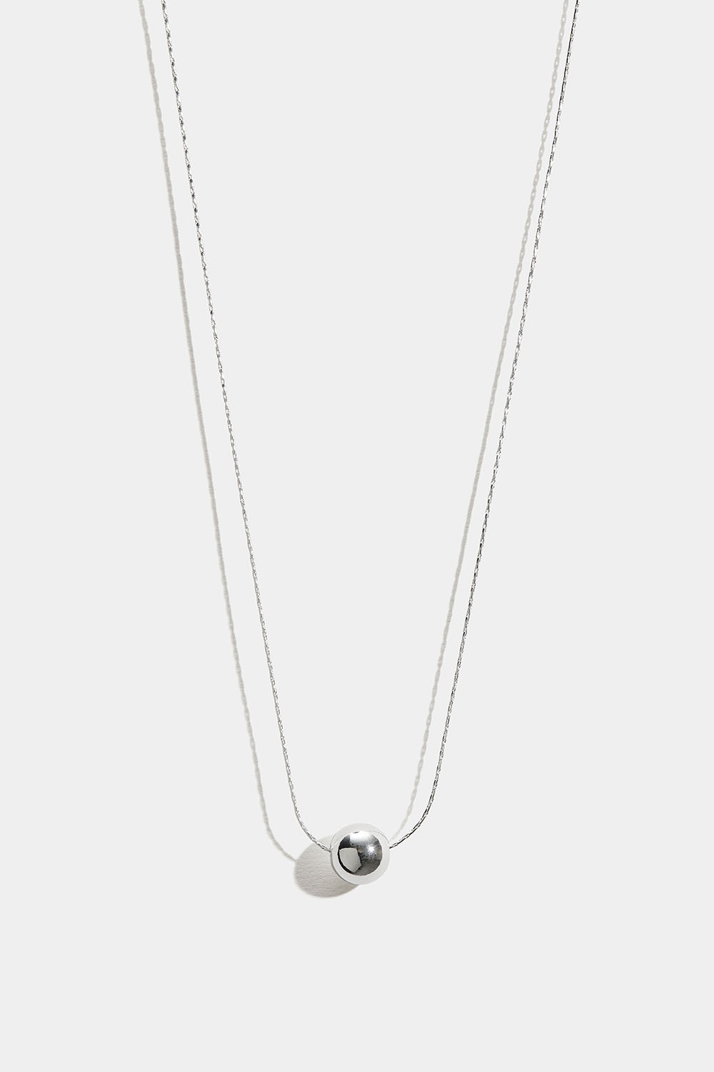Rundt, kompakt, sølvfarget halskjede med en sølvfarget kule