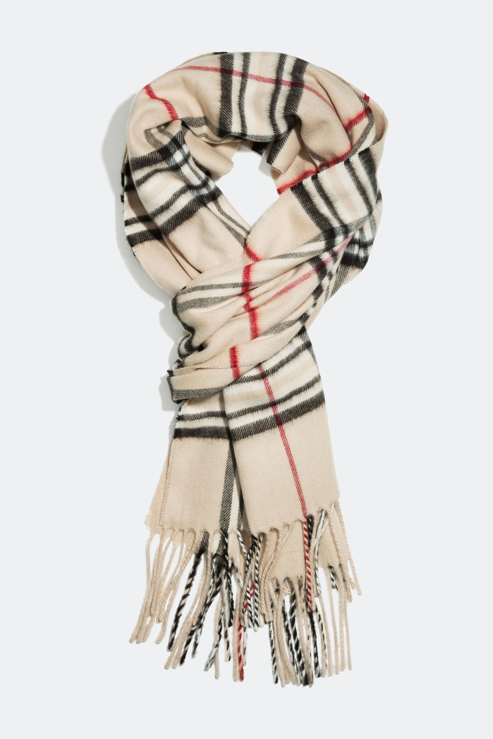 Rutete skjerf i blandede farger, med både rosa og beige som grunnfarger. Mykt og varmt høst- og vintertilbehør for kjølige dager.