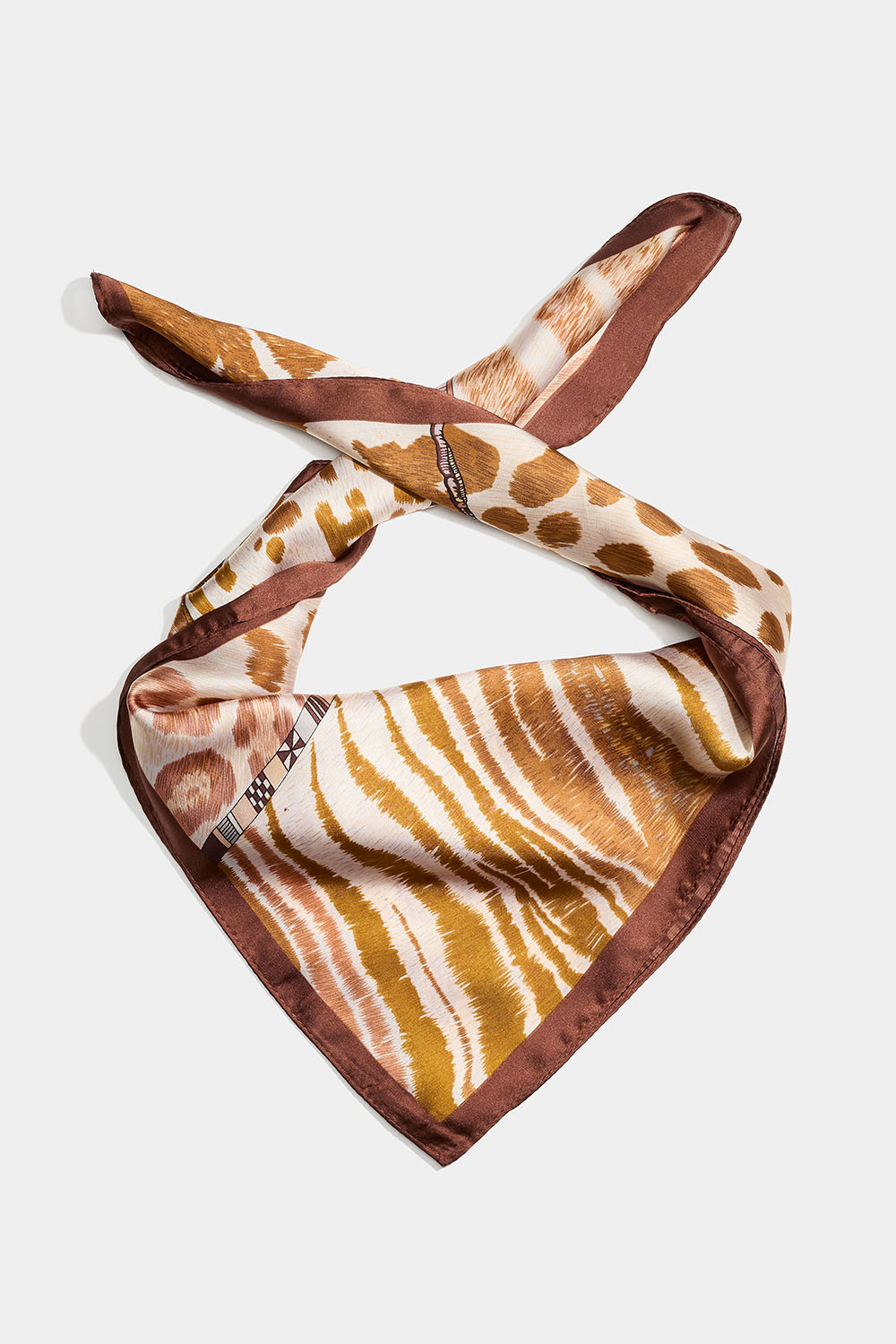 Satengskjerf med dyremønster i en kombinasjon av brunt, beige og grønt.