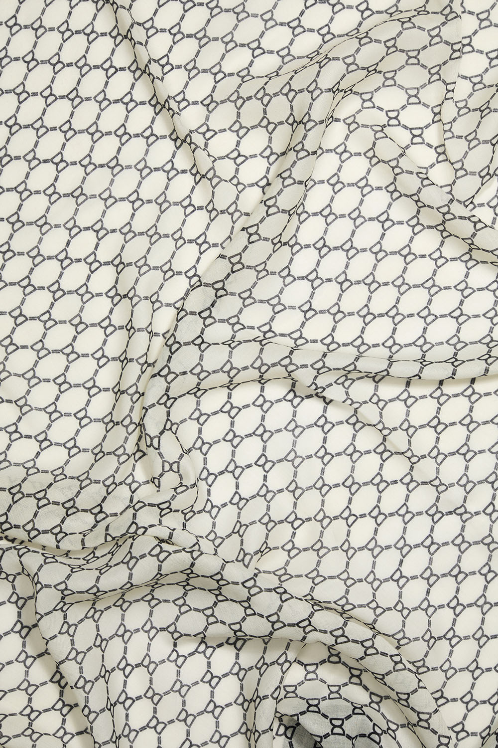 Stort rektangulært sjal i tynt materiale med svart og hvitt DD-mønster.