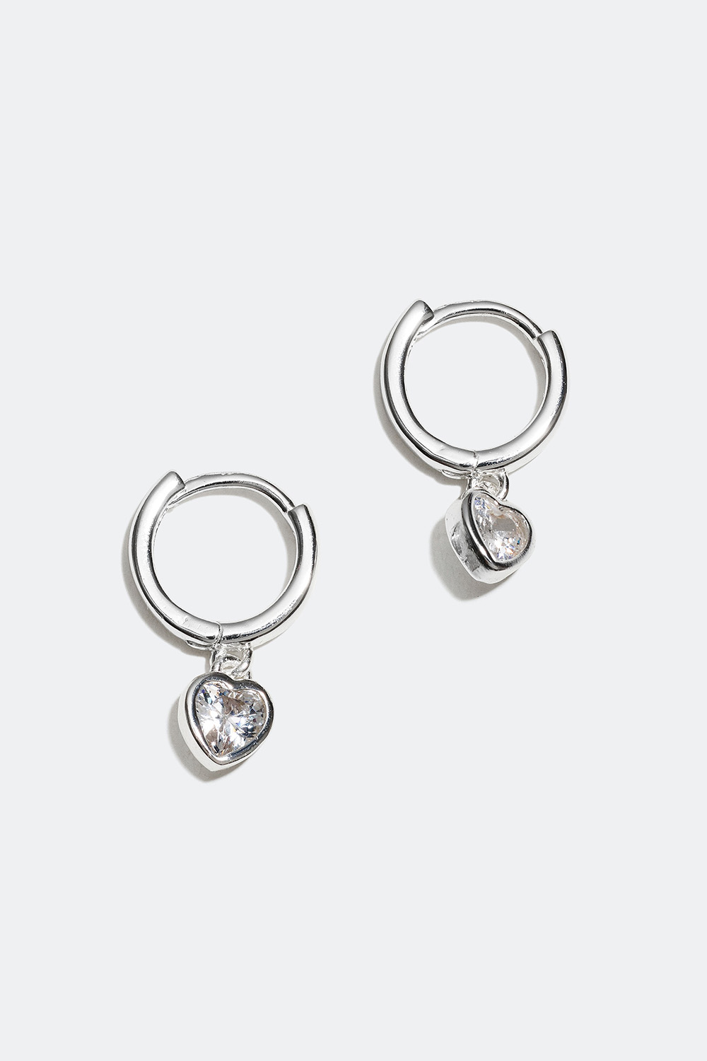 Små bøyler i ekte sølv med dekorative hjerter med Cubic Zirkonia-stener som anheng. Søte øredobber som alle både til hverdags og fest.