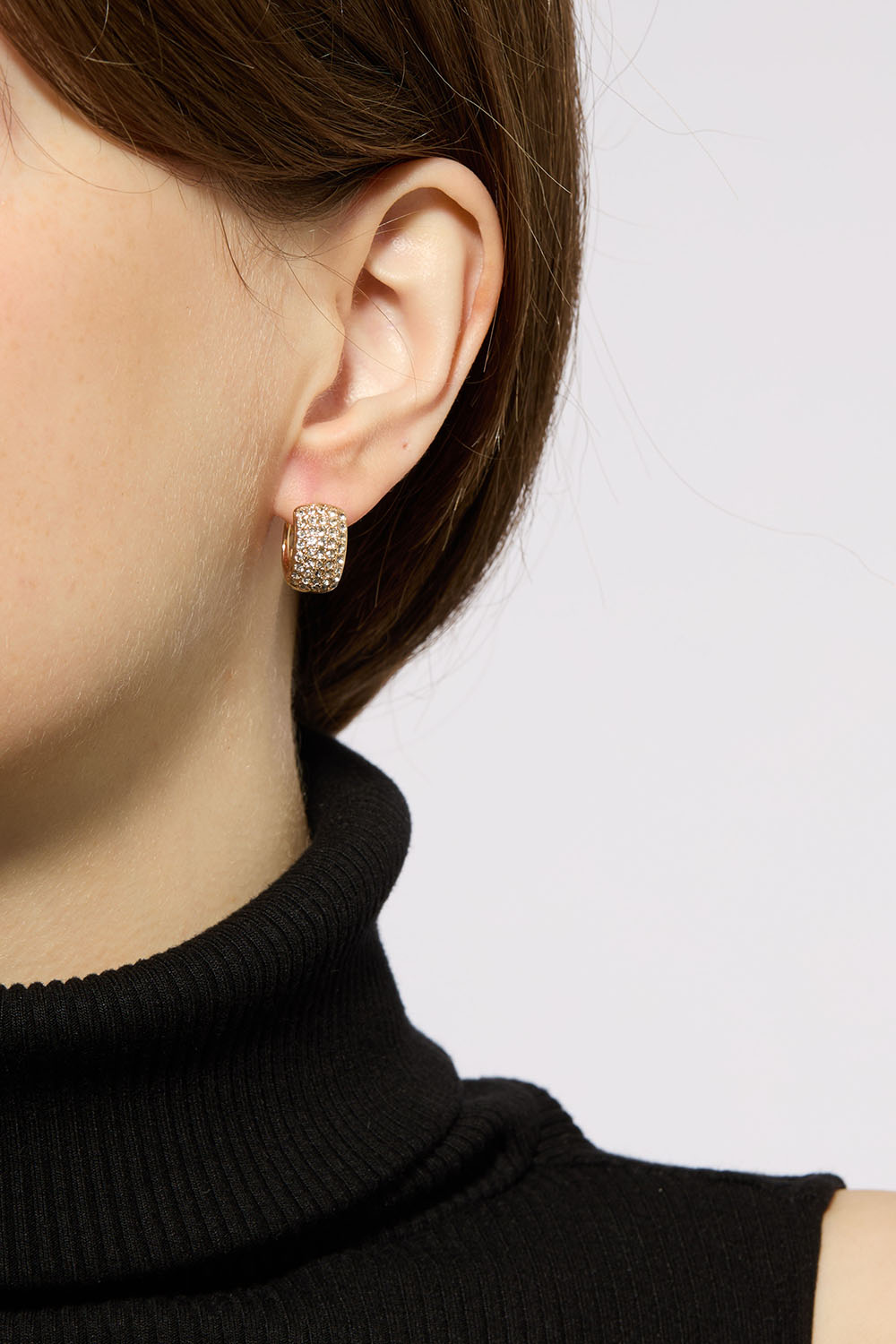 Små gullfargede øreringer i bred design, dekorert med strass på forsiden.
