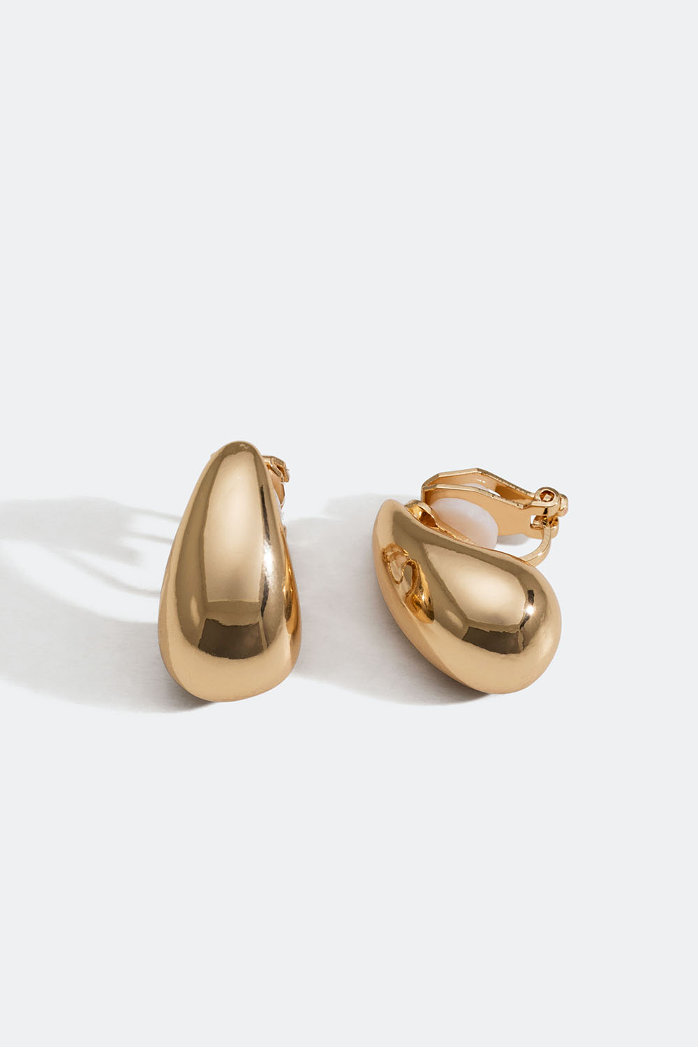 Små, dråpeformede klipsøredobber i blankt gullfarget metall. Et par stilrene øredobber som passer perfekt til deg som ikke har hull i ørene.