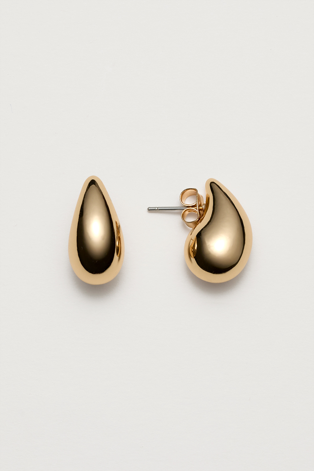 Små, dråpeformede studs i blankt, gullfarget metall. Et par diskre øredobber i stilren design, som passer til alle anledninger.