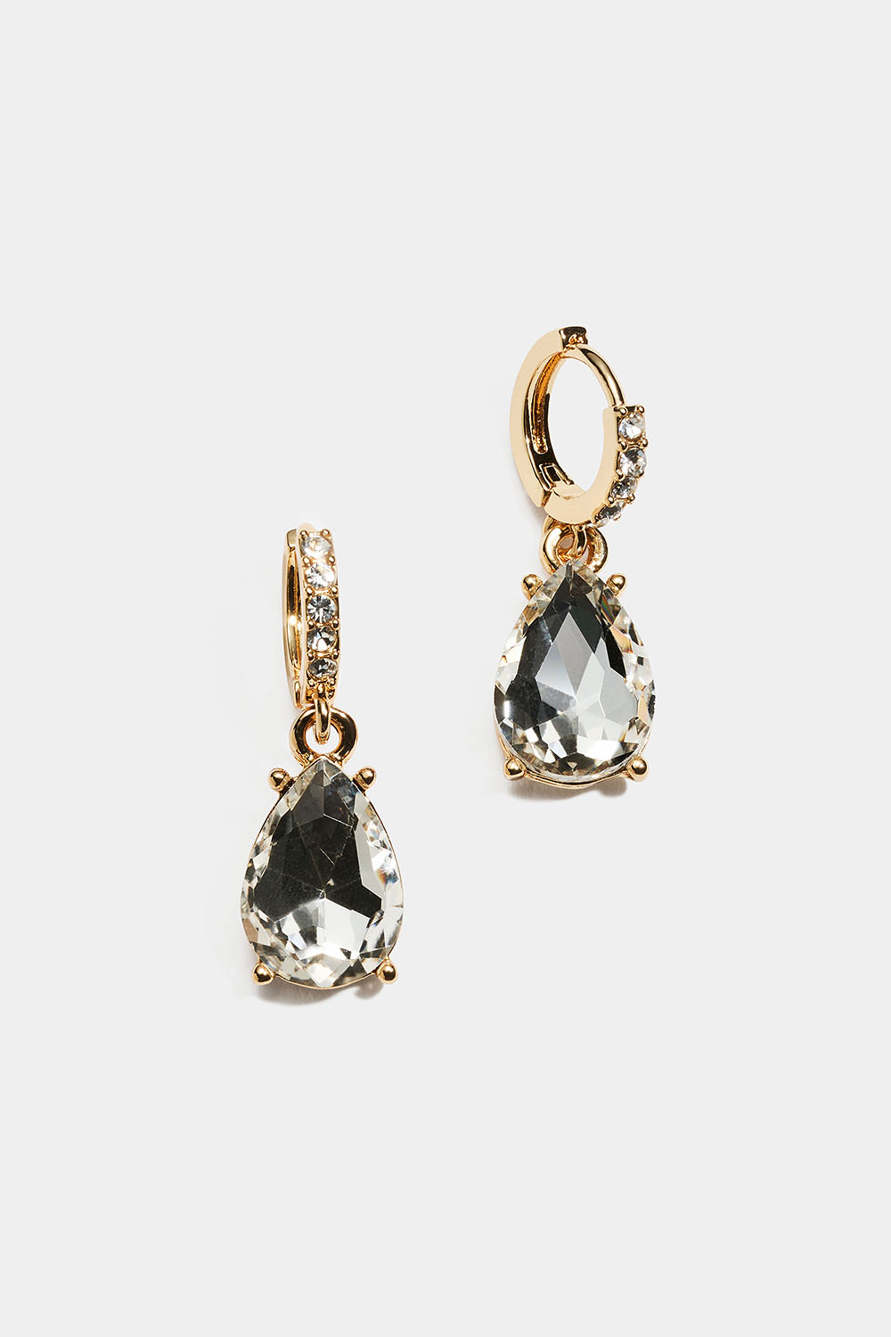 Små hoops i gullfarget metall dekorert med små hvite glassteiner, med en stor hengende dråpeformet glasstein.