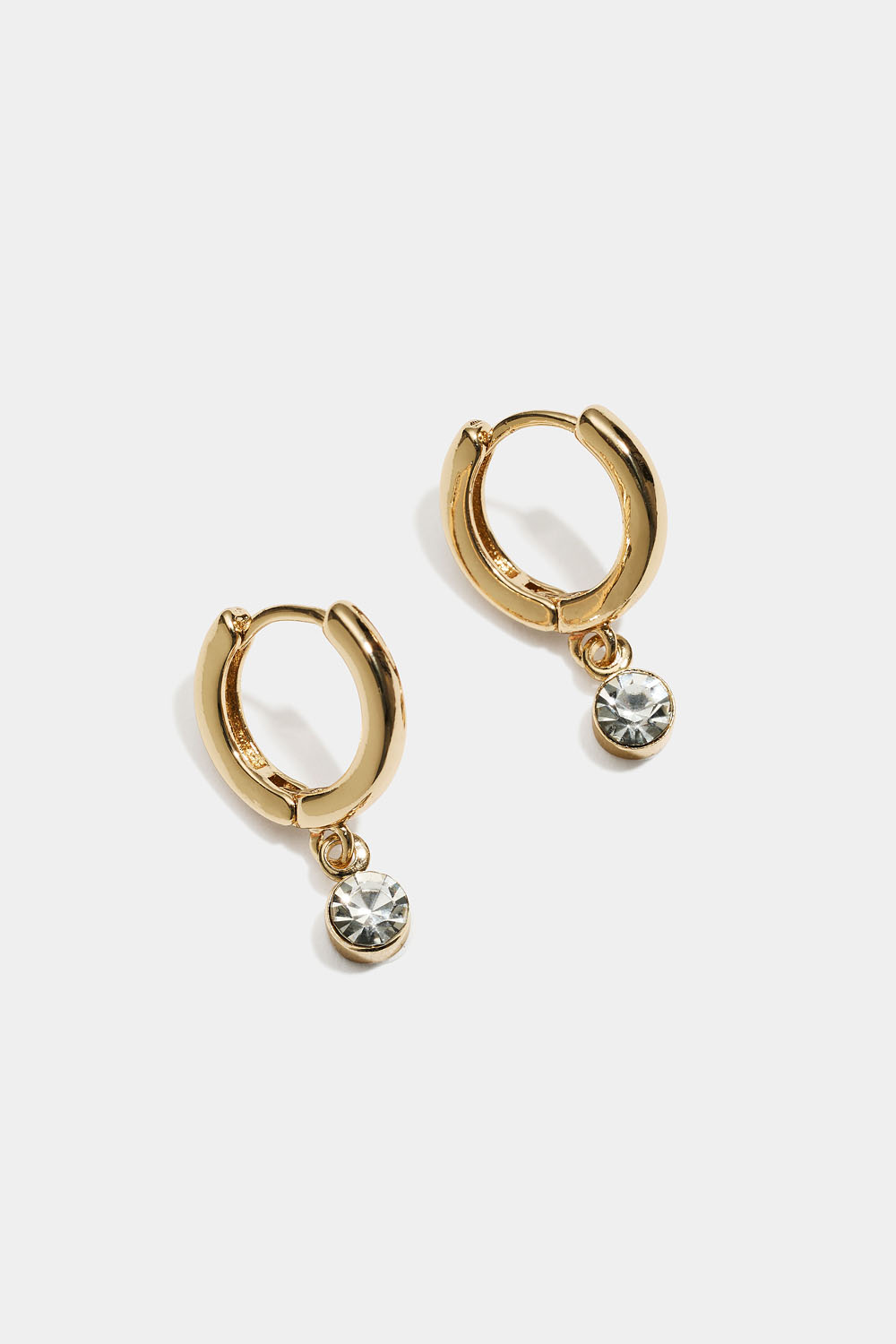 Små øreringer i gullfarget metall med en liten rund, hengende glasstein.