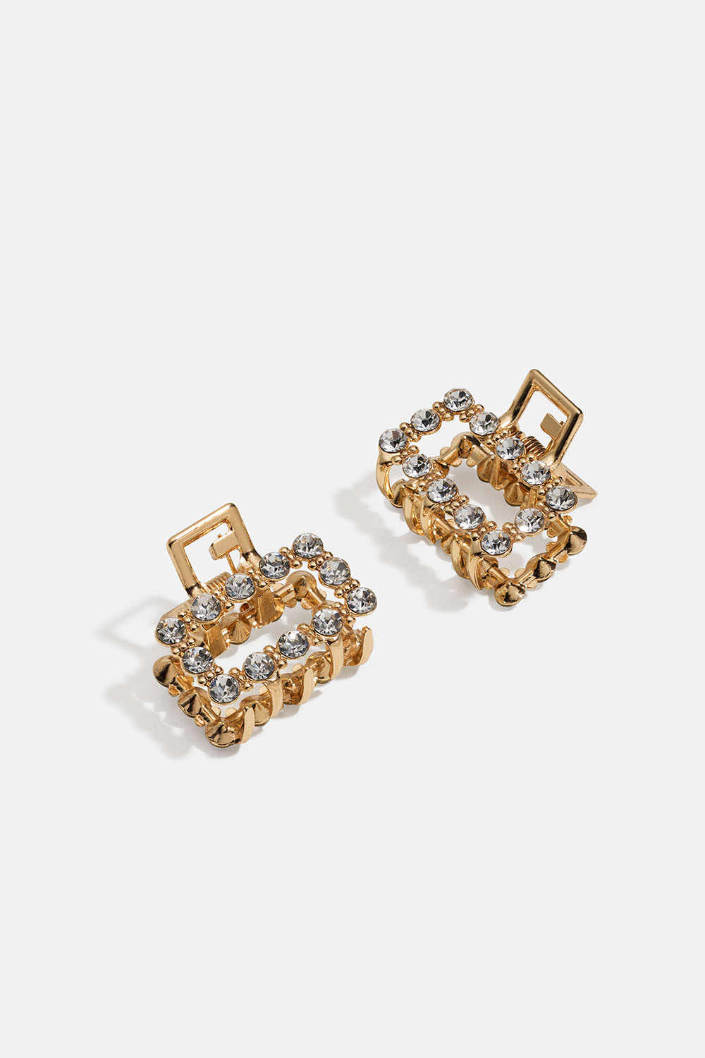 To små gullfargede hårklemmer med hvite glassteiner