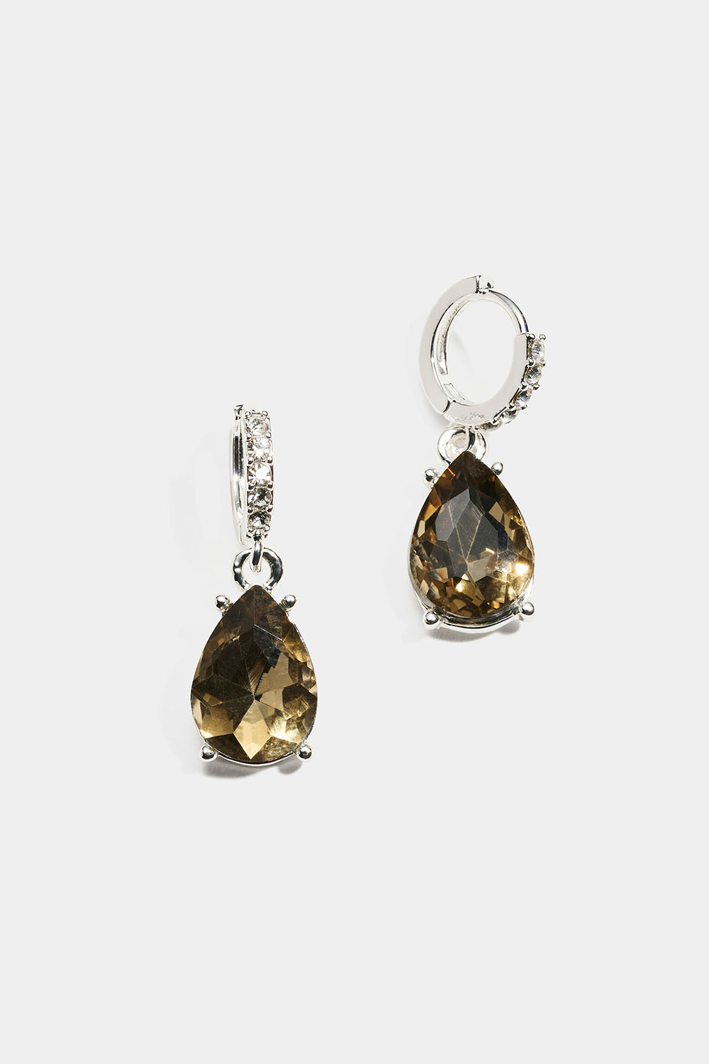 Små hoops i sølvfarget metall dekorert med små hvite glassteiner, med en stor hengende lysbrun dråpeformet glasstein.