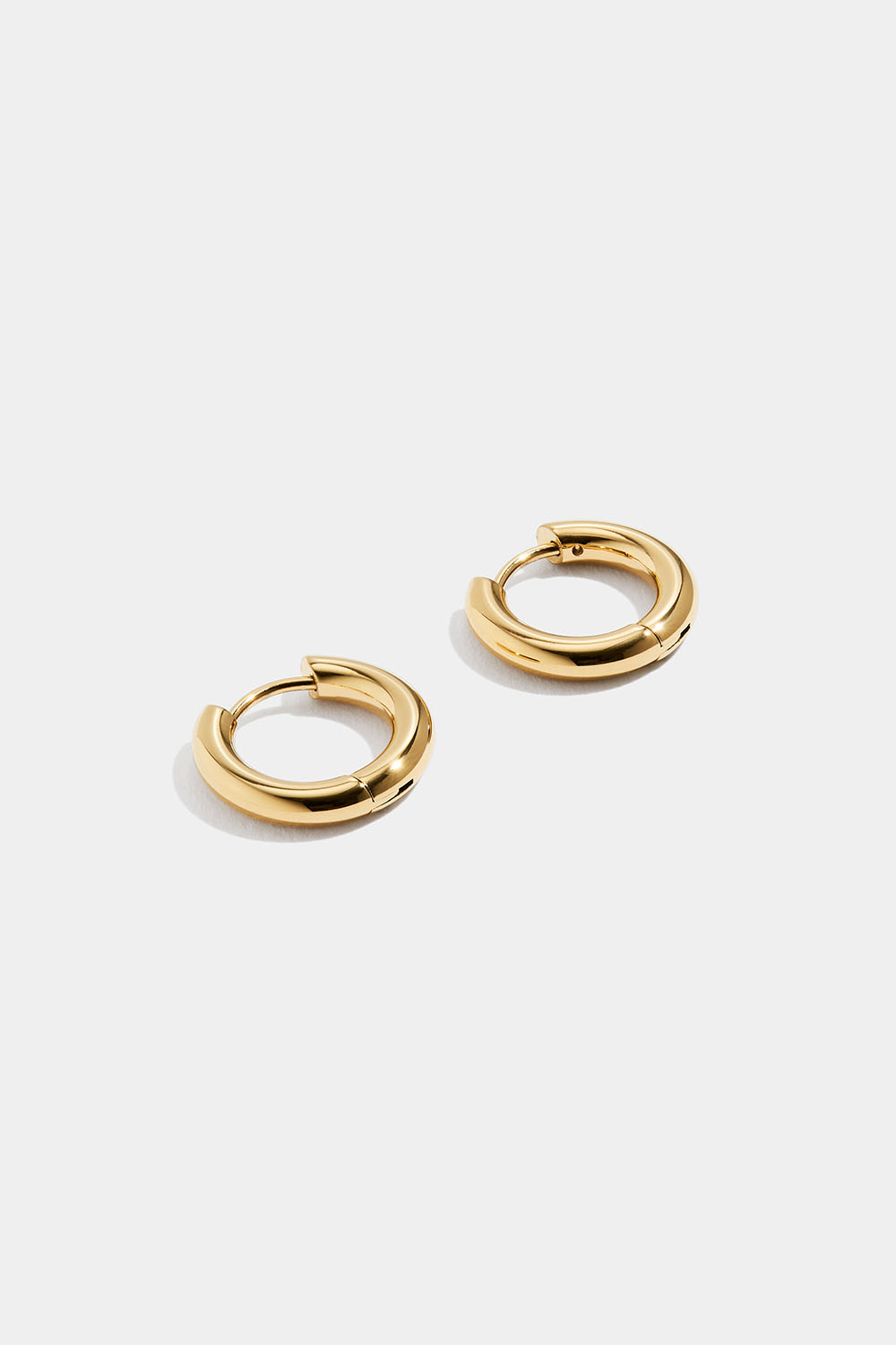Små, kraftigere øreringer i høypolert rustfritt stål som er PVD-belagt med 18 karat gull.