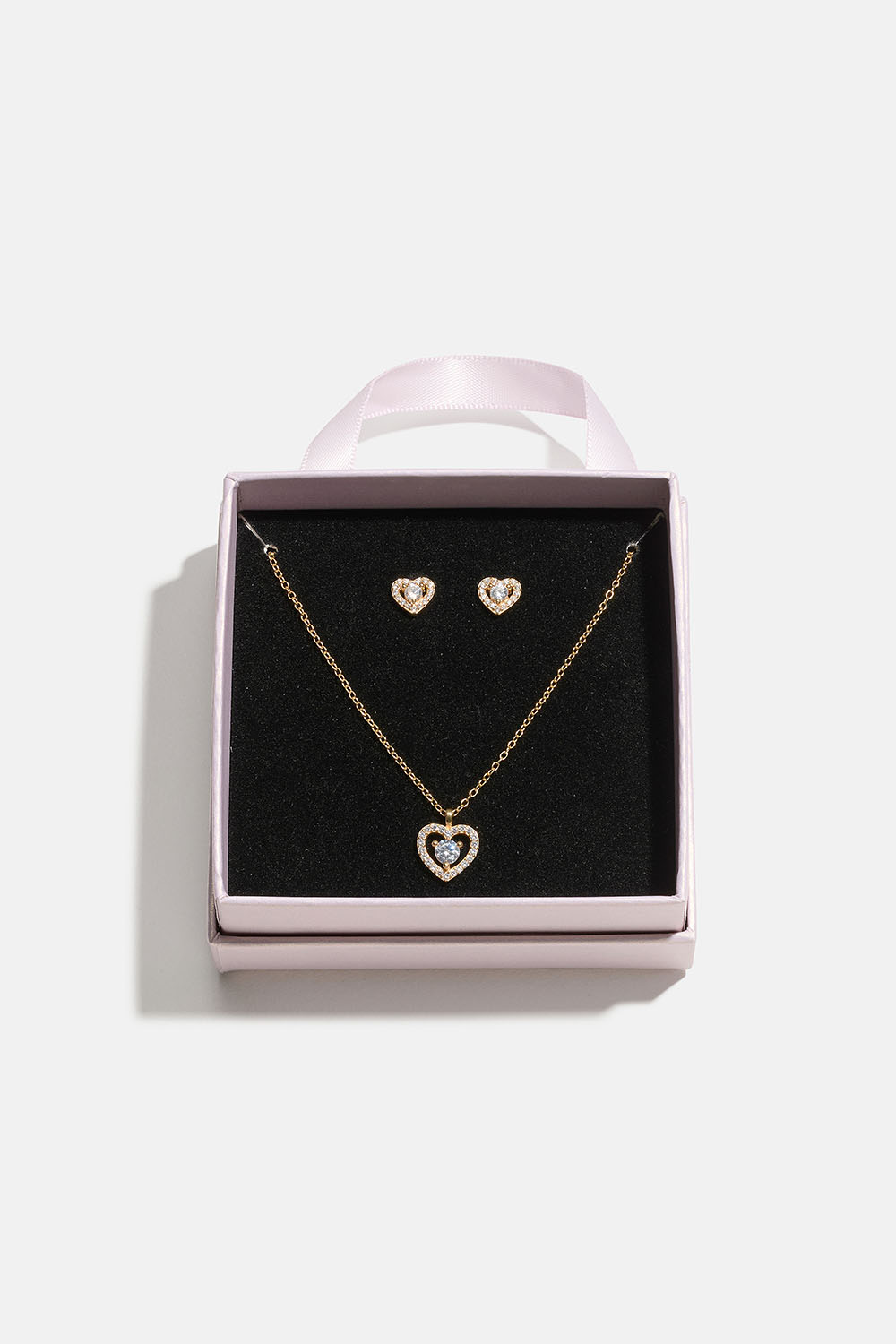 Smykkesettet består av et par øredobber med hjerter og kubisk zirkonia og et halskjede med hjerteanheng og kubisk zirkonia i 18k gullbelagt ekte sølv. Settet er pent pakket i en rosa gaveeske med fyll i svart velur.