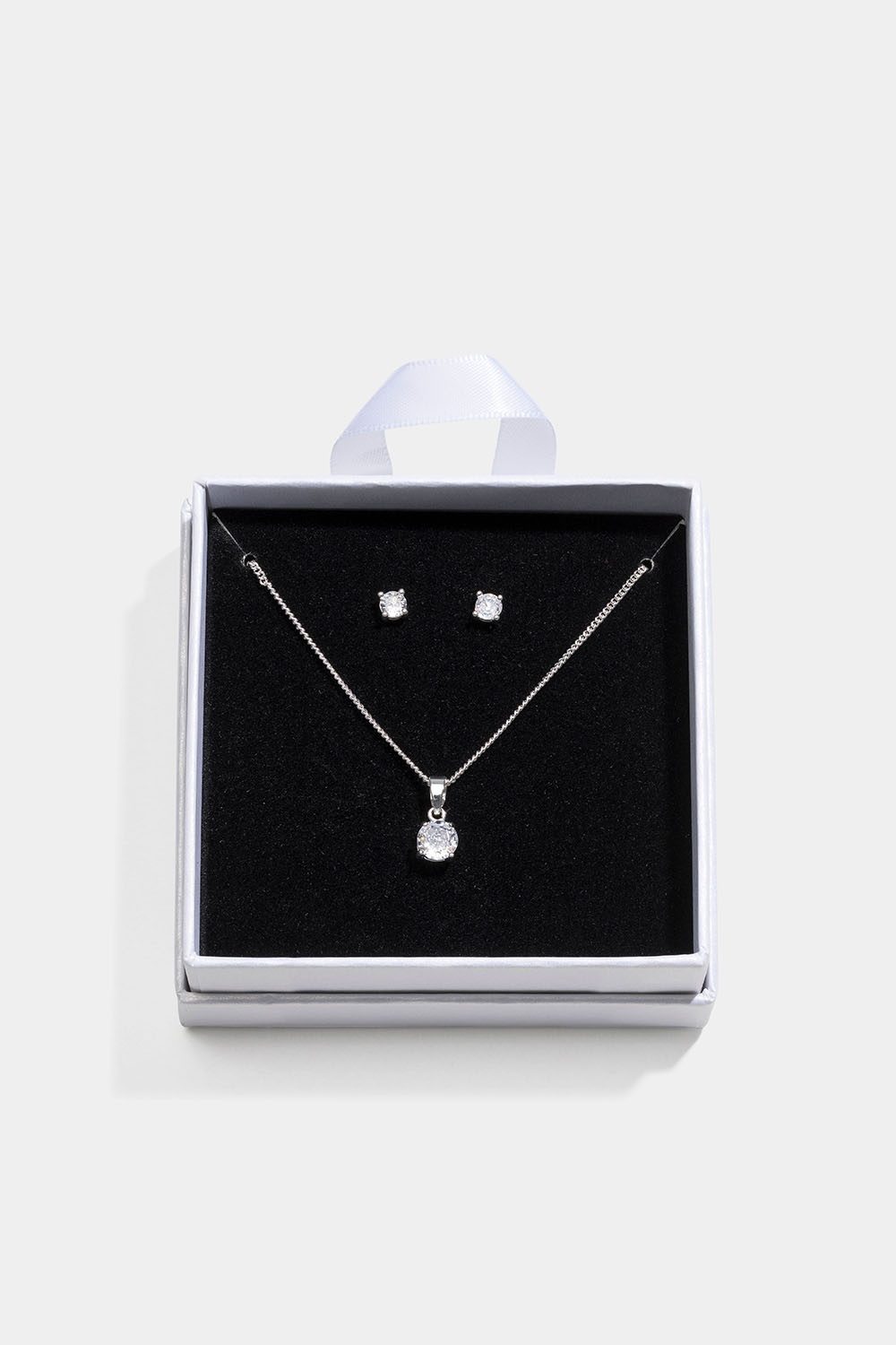 Smykkesettet består av et par sølvfargede øredobber med hvite glassteiner og et sølvfarget kjede med hvit glasstein, pent pakket i en hvit gaveeske med sort velurpute.