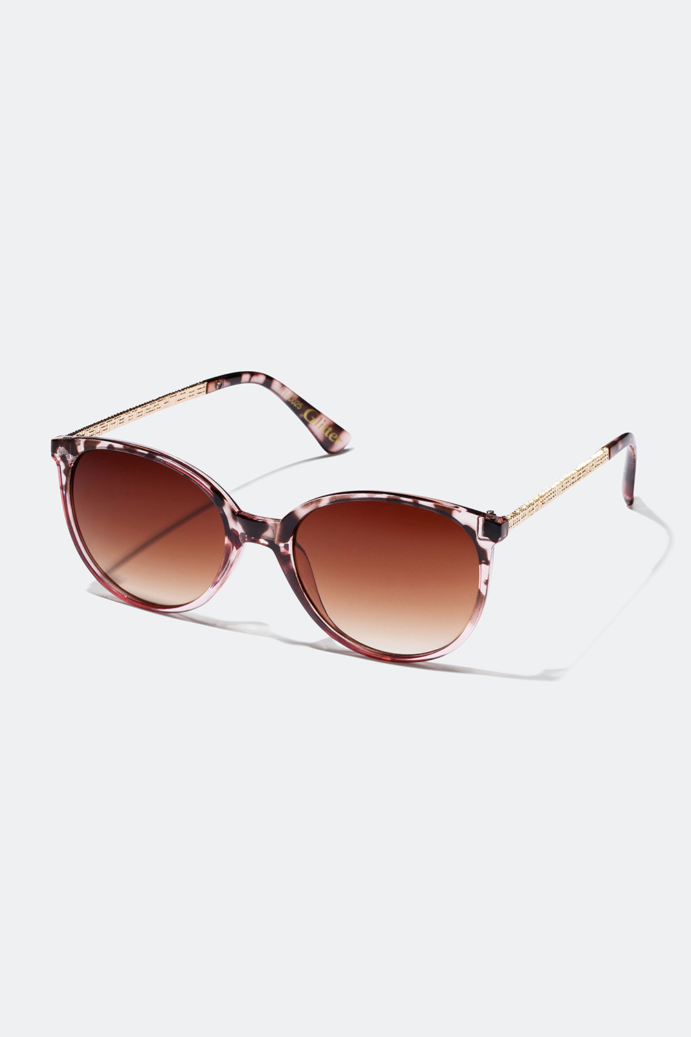 Mønstret solbrille i plast med dekorative gylne detaljer med riflet design. Solbrillen har stenger i gyllent metall med plast ytterst. En dekorativ solbrille i lyse farger, som passer perfekt til vårens og sommerens solfylte dager.