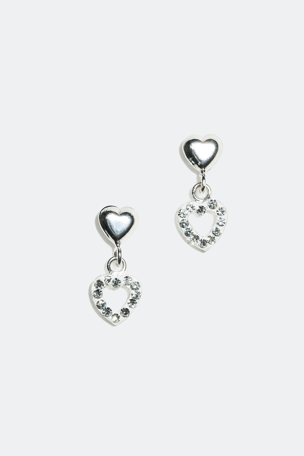 Sølv øredobber med to hjerter - Et par øredobber i ekte sølv med et lite hjerte og et anheng med et lite hult hjerte under, dekorert med glass steiner.