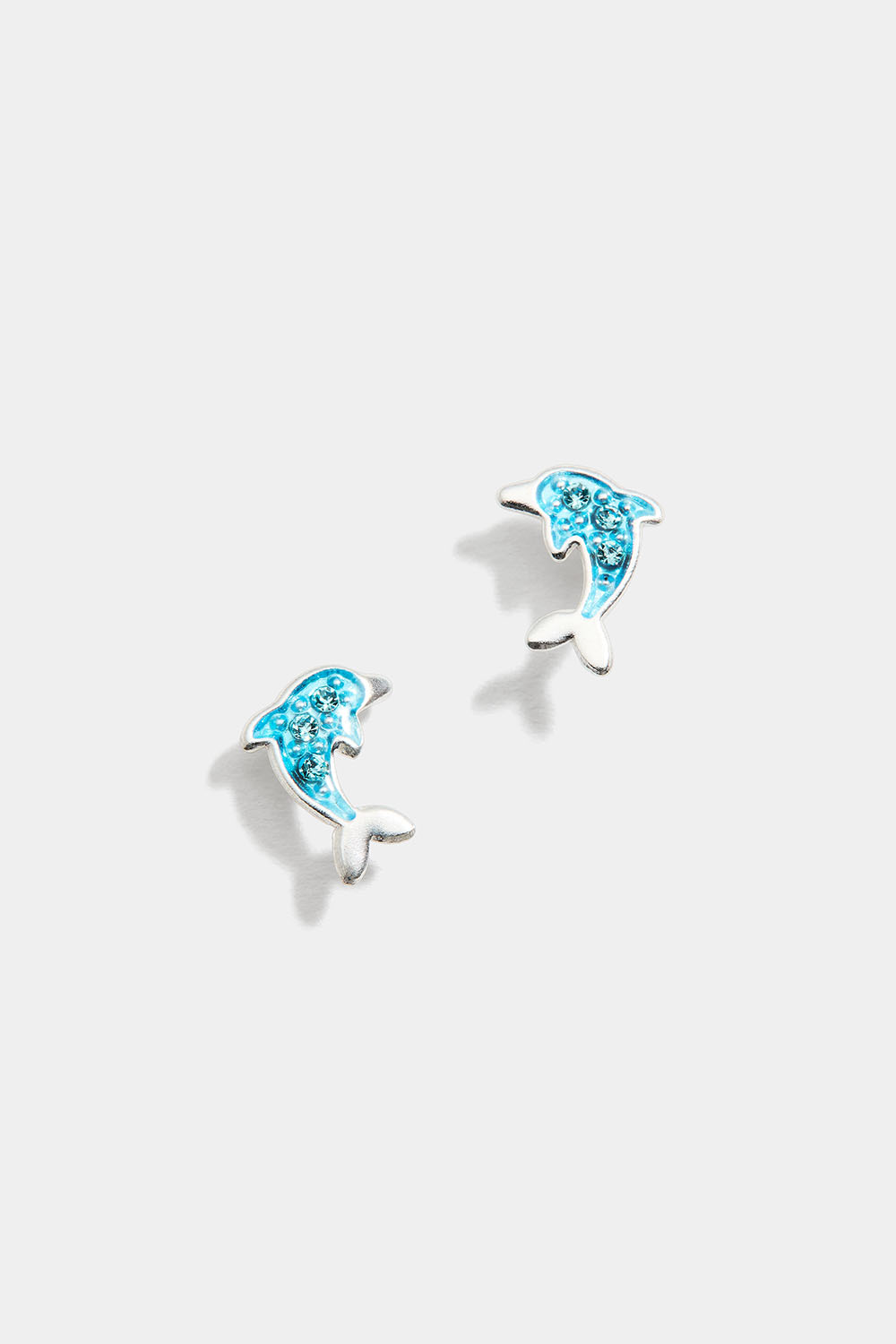 Øredobber for barn i ekte sølv. Øredobbene er formet som delfiner og pyntet med blå glassteiner.