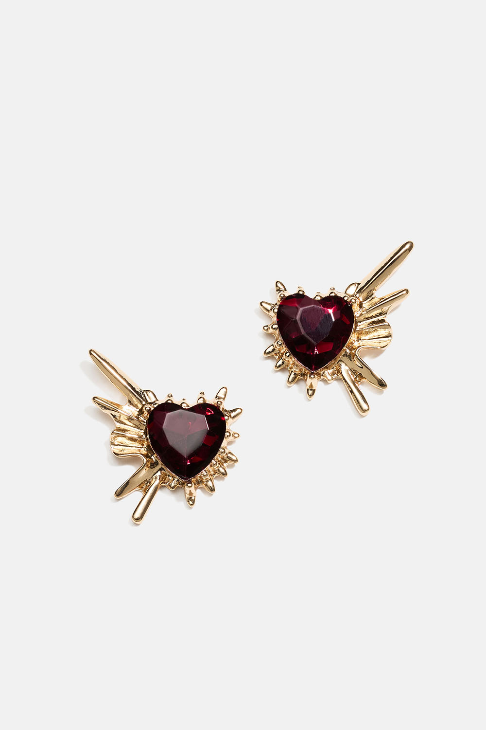 Studs med spisse detaljer og burgunderfargede hjerteformede glassteiner.