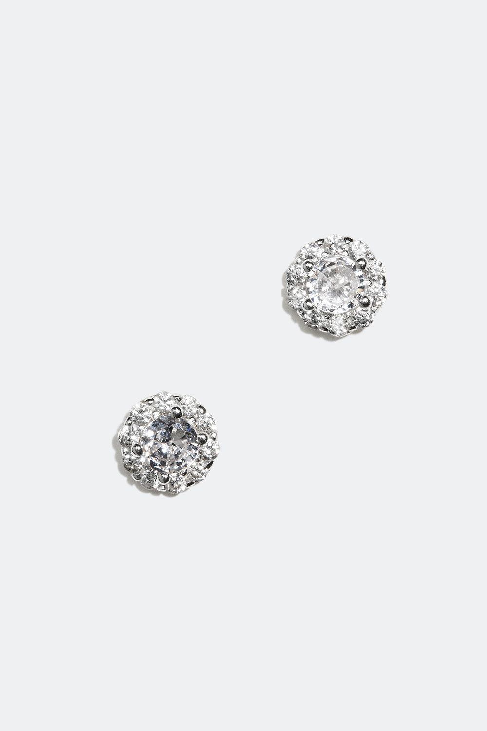 Små, runde stiftøredobber i ekte sølv, pyntet med en større zirkonia-sten og små zirkonia-stener plassert rundt den. Et par enkle, men glitrende øredobber som passer til flere slags anledninger.