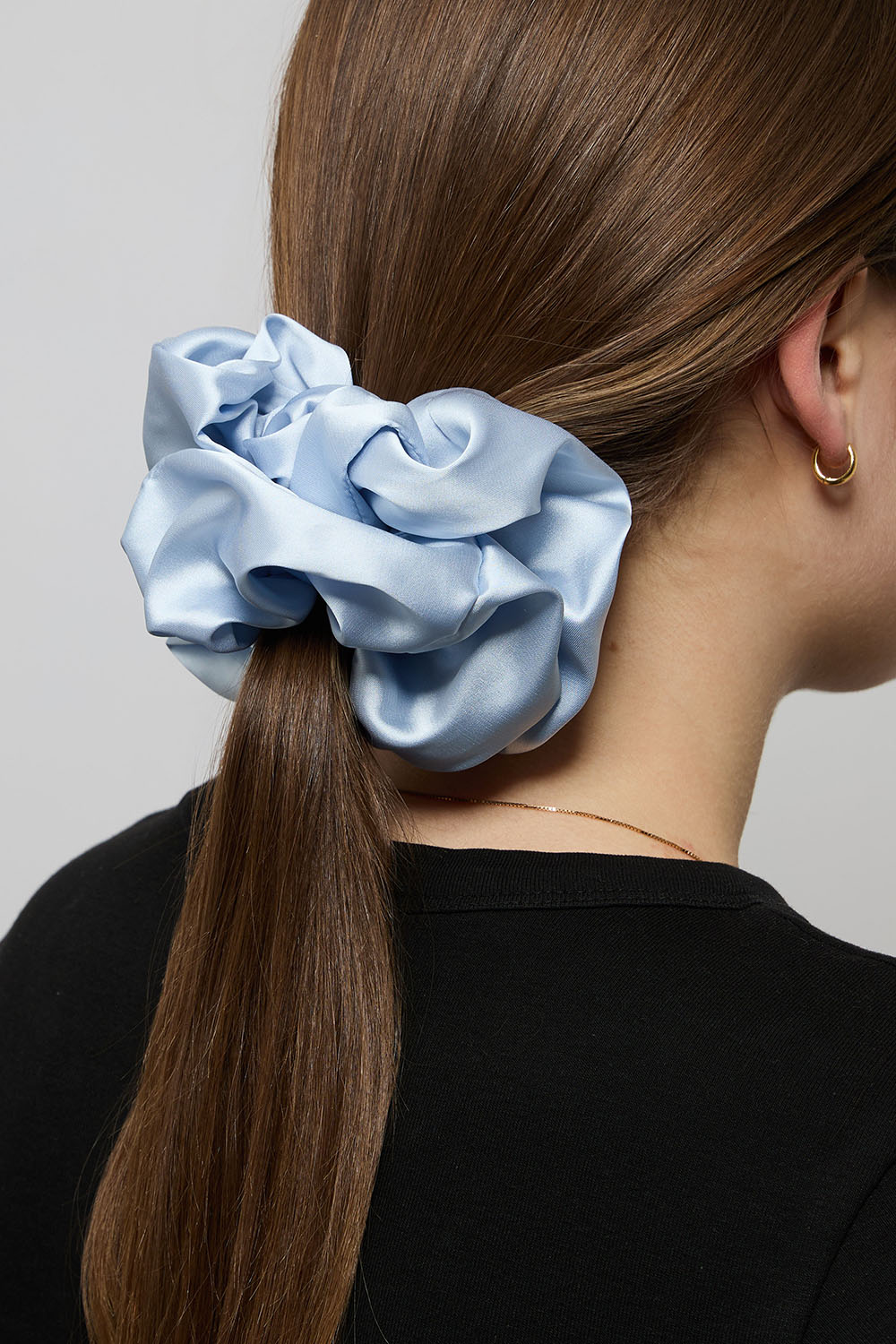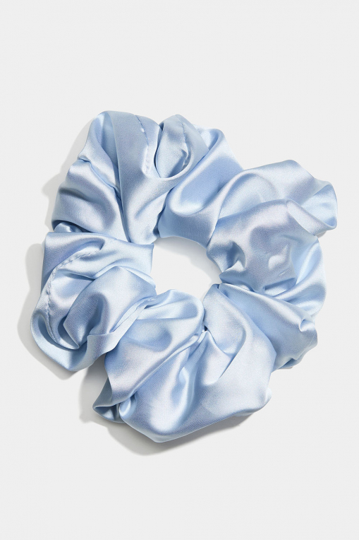 Stor lyseblå scrunchie i skinnende silkeimitasjon. Fint hårtilbehør med mye volum som passer perfekt til f.eks. en lav hestehale eller hårknute.
