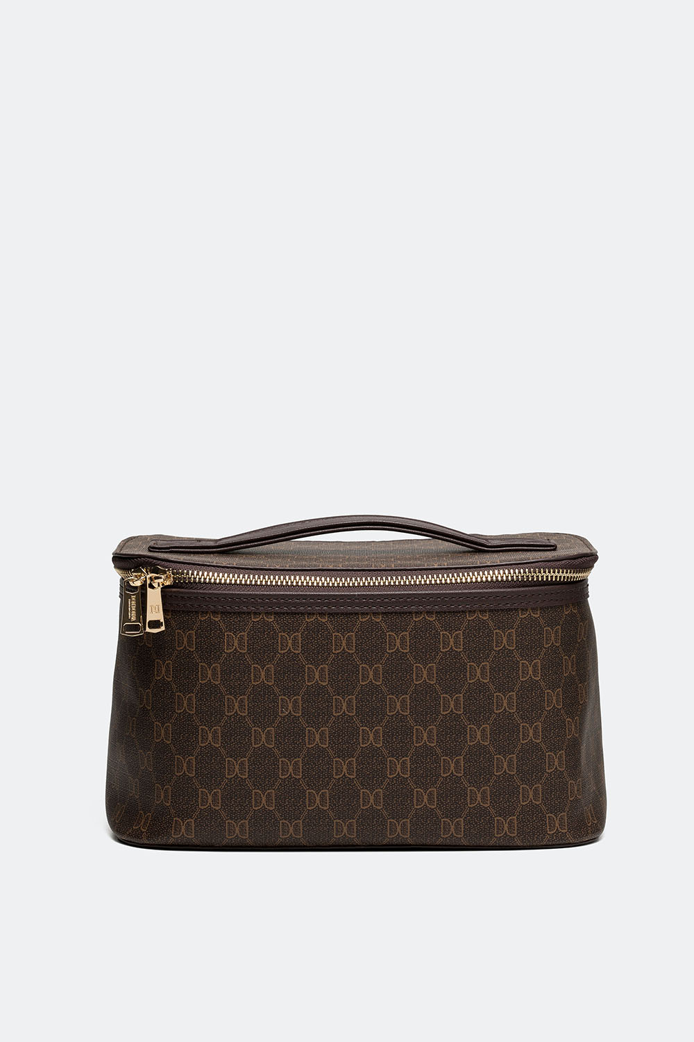 Stor brun toalettmappe med trykt Don Donna-logo. En romslig toalettmappe med plass til nødvendige ting, kommer også med flere små innerlommer for små produkter.