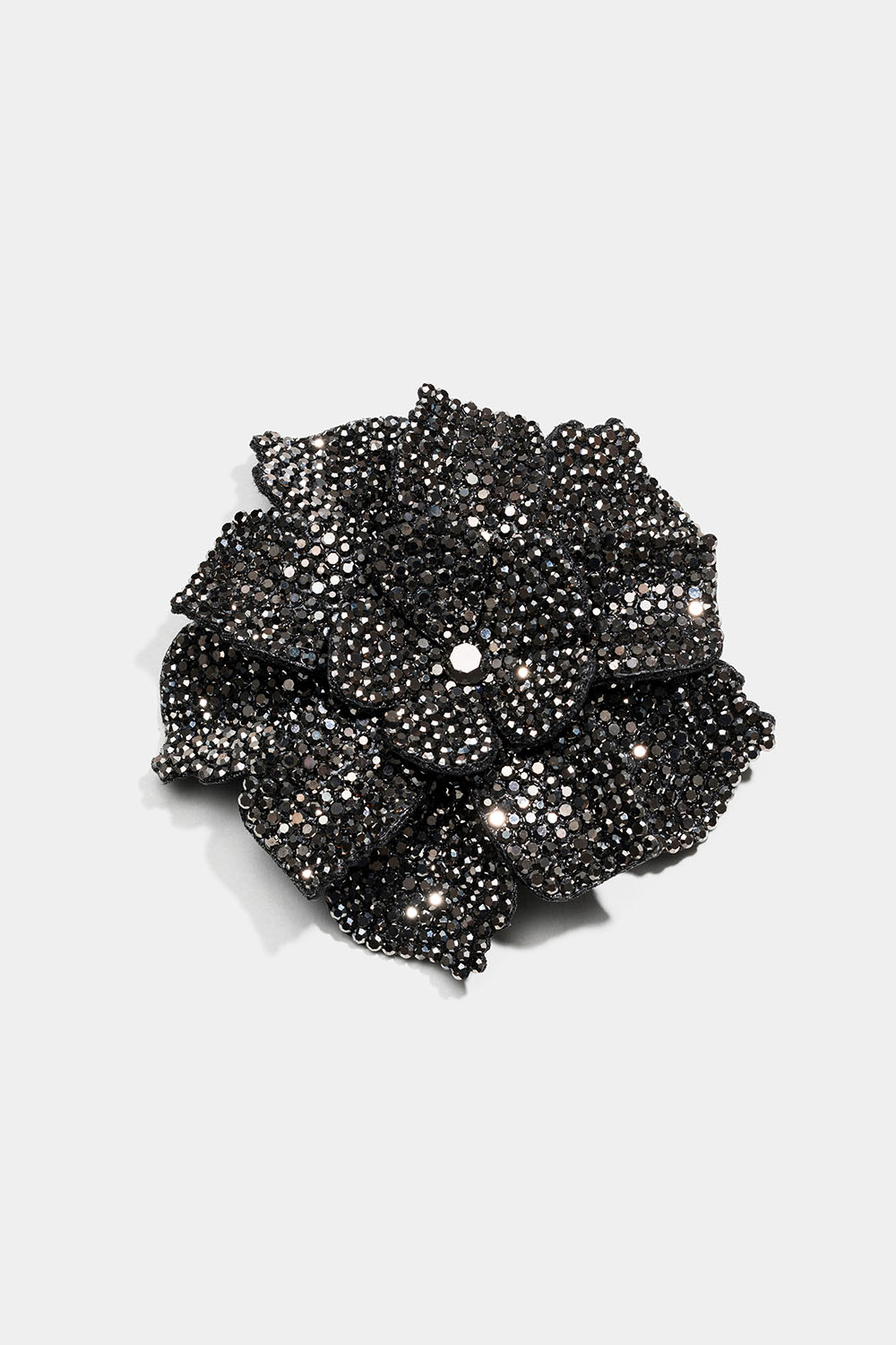 Iøynefallende nål med stor blomst av mørkegrå steiner av glass.