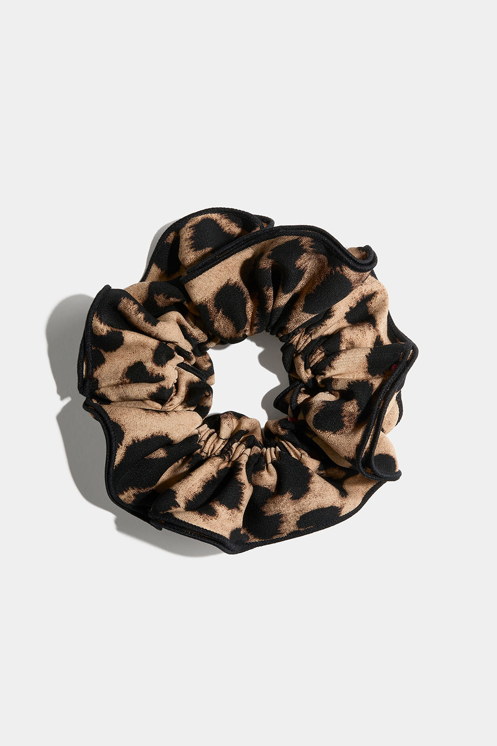 Scrunchie i leopardmønstret stoff i flere lag med sydd kant.