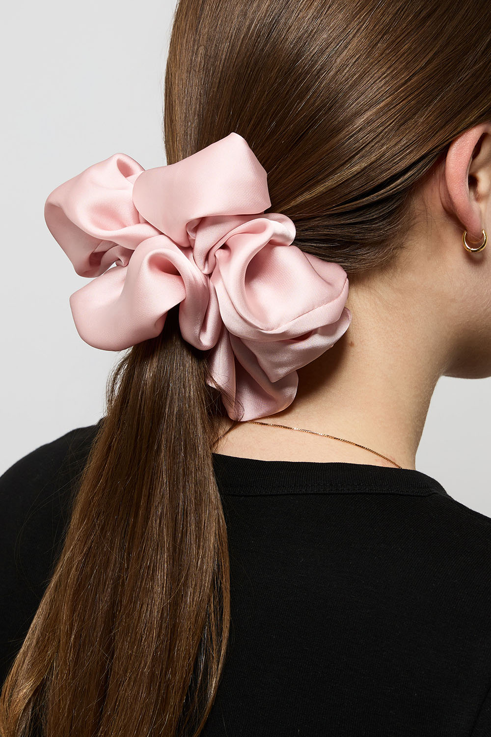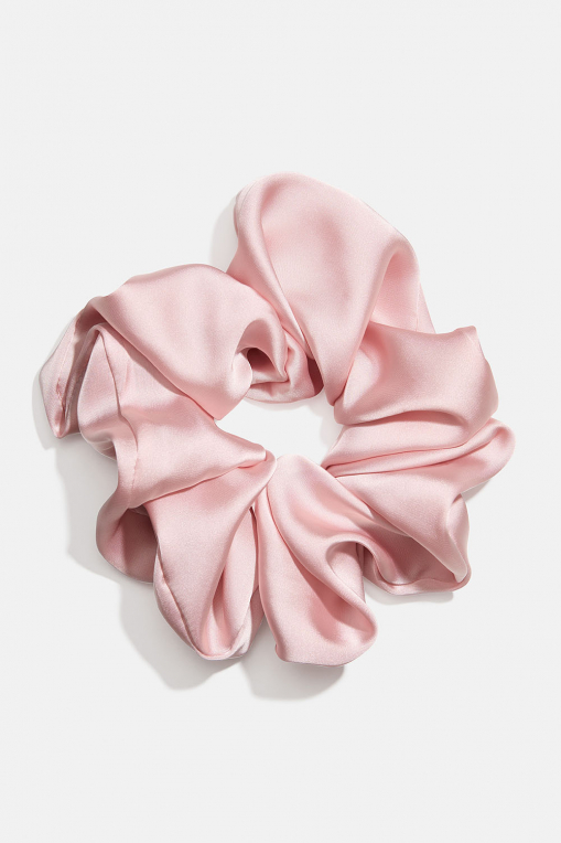Stor lyserose scrunchie i skinnende silkeimitasjon. Fint hårtilbehør med mye volum som passer perfekt til f.eks. en lav hestehale eller hårknute.
