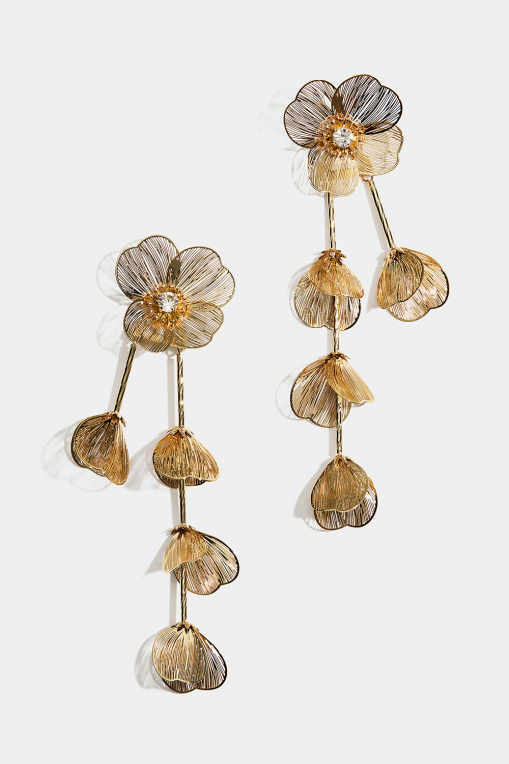 Store gullfargede øredobber med blomster og hengende blomsterblad