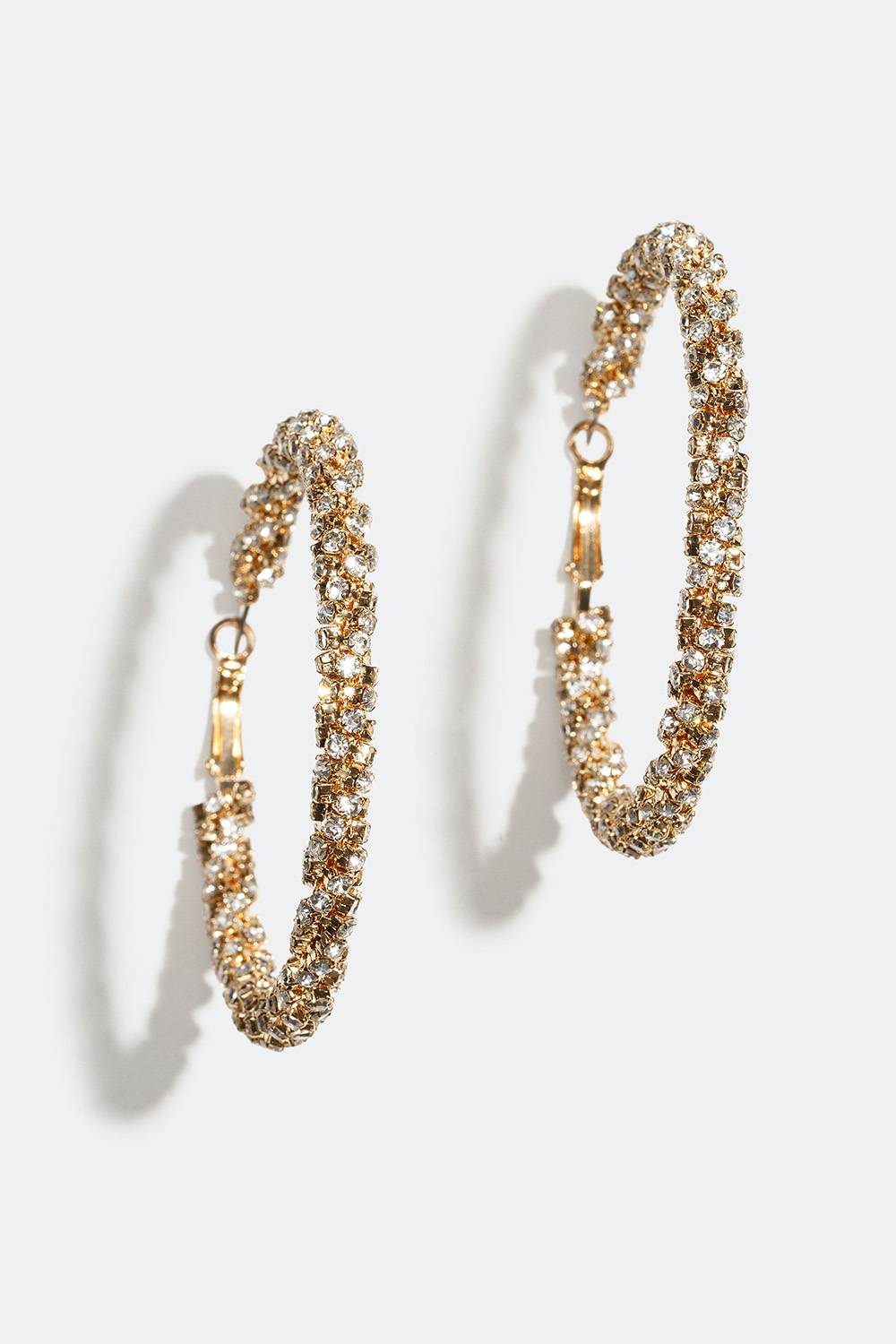 Store øreringer i gullfarget metall som er dekorert med blanke glassteiner i et tvunnet design. Et par skinnende øredobber som er perfekte å bruke hvis du ønsker å kle opp et festantrekk.