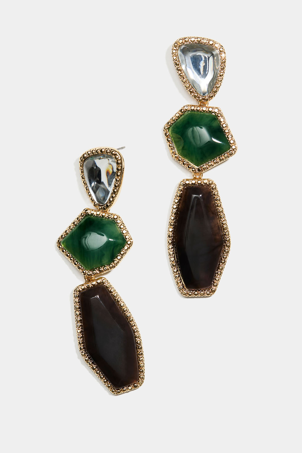 Store øredobber med anheng i forskjellige former. Steinene er i brunt, grønt og hvitt og er omgitt av en gullfarget kant.